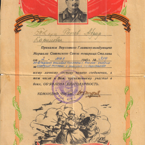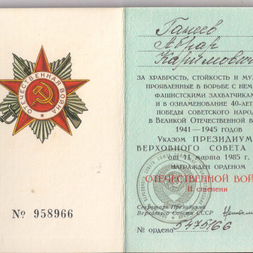 Родился 26 мая 1921 года в деревне Клянчеево, Кам-Устьинского района республики Татарстан. С малых лет помогал родителям вести хозяйство. Вскоре семья была раскулачена и сослана на строительство Магнитогорского комбината.С началом войны молодым юношей был призван на фронт. Проявляя мужество и отвагу, сражался на Северо-Западном и 1-м Белорусском фронтах, в составе 138 отдельного моторизованного понтонно-мостового батальона в первых рядах участвовал в форсировании рек Одер, Висла, Эльба, освобождении Варшавы и других городов, взятии Берлина. Был ранен, награжден орденами "Красная Звезда", "Отечественной войны", медалями "За отвагу", "За освобождение Варшавы", "За взятие Берлина", "За победу над Германией" и другими, многочисленными благодарностями.Но и 9-го мая 1945-го война не закончилась для него, около года участвовал в востановлении разрушенных городов.Судьба уберегла Солдата и сохранила ему Жизнь. Вернувшись в 1946 году домой, продолжил трудовую деятельность на ММК. Создал семью, вырастил сына , воспитал двух внуков. За честный и добросовестный труд награжден медалью "Ветеран труда", многочисленными грамотами и памятными подарками.Время безжалостно - 29 февраля 2000-го, Абрар Каримович ушел из жизни. Это был Добрый, Честный, Трудолюбивый и Благороднейший Человек! Память о нем всегда бережно будет храниться в наших сердцах, а боевые ордена и награды ярко сверкать в лучах солнца.Я очень горжусь своим дедушкой и люблю его. Он всегда со мной! Большая Благодарность Подвигу Солдата!