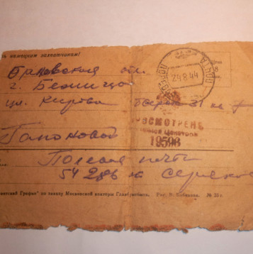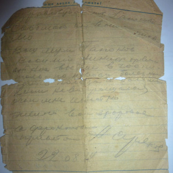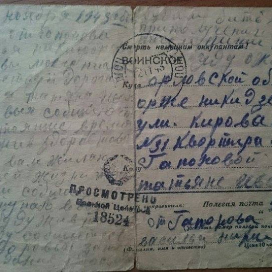 В-первых строках моего письма,Здравствуй, дорогая супруга Татьяна Ивановна.Во-первых сообщаю что в настоящее время жив здоров, того и вам желаю в вашей жизни.Я вам сообщаю, что я вступаю в бой, если буду жив, то всем буду сообщать о своем здоровье.Затем до свидания.Будем бить врага.При получении моего письма, пиши ответ.Буду ожидать.КУДА: орловская область, г. Орджоникидзеград., ул. Кирова, барак 31, квартира 7КОМУ:Гапоновой Татьяне Ивановне."