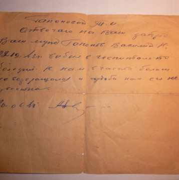 "Здравствуйте,товарищ Гапонова.Сообщаю на ваше письмо.Ваш муж Гапонов Василий Никифорович выбыл в госпиталь по болезни.К нам в часть не возвращался.С фронтовым приветом А.Серяков."