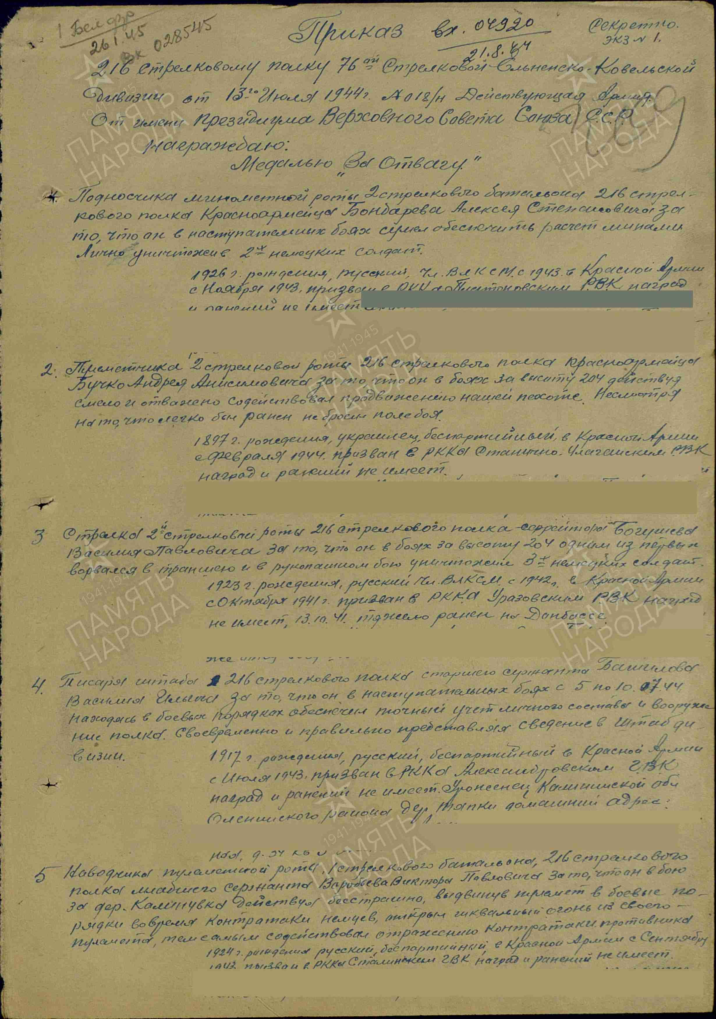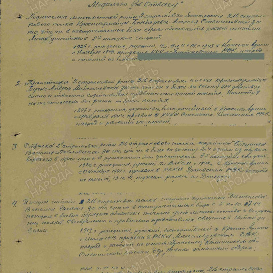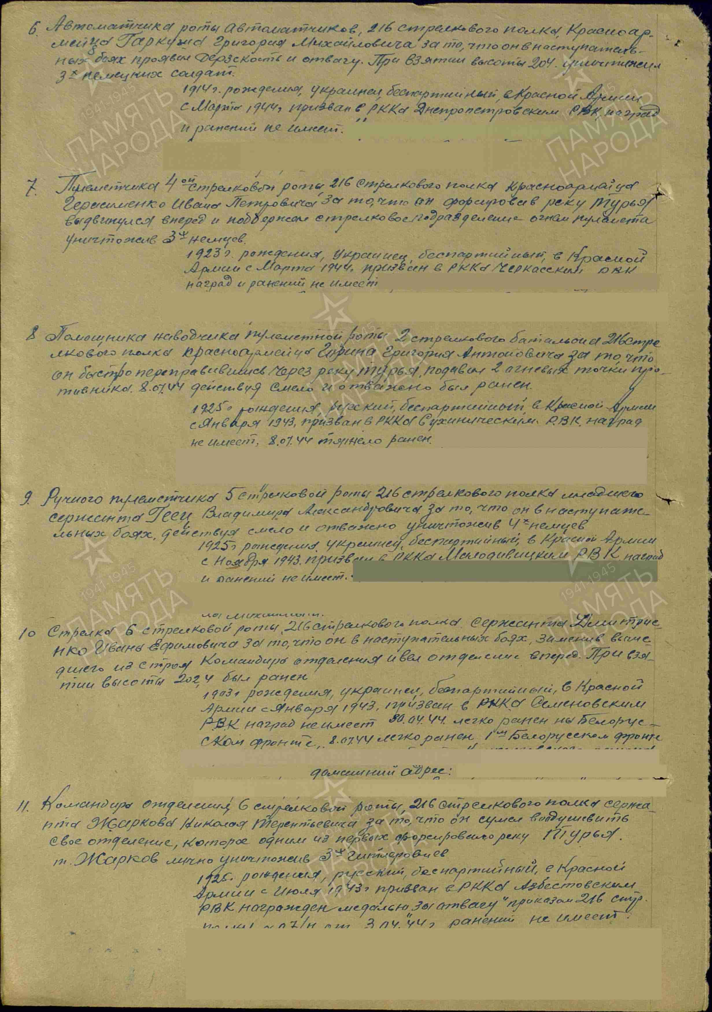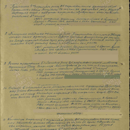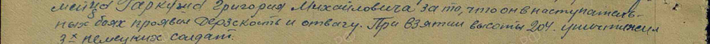 Так бывает в дни войны, Есть минуты тишины, Когда бой умолкает устало, И разрывы почти не слышны. И именно в такие короткие, обманчиво спокойные мгновения особенно ясно проступает человеческая суть — хрупкая, но способная на величие. В эти паузы между огнём и движением решаются судьбы, рождаются подвиги, которые потом вплетаются в ткань большой истории. Июль 1944 года. Земля дрожала в предчувствии наступления — готовилась Люблин-Брестская операция. Части Красной армии стягивались, проверяли оружие, вглядывались в линию горизонта, где за высотой с отметкой 204 скрывался враг. Эта высота была не просто точкой на карте — она была ключом, который открывал путь вперёд. В рядах 216-го стрелкового полка 76-й стрелковой дивизии шёл в бой красноармеец Григорий Михайлович Гаркуша. Один из многих — и в то же время единственный, со своей судьбой, своим страхом и своей решимостью. 13 июля бой разгорелся с новой силой. Подступы к высоте простреливались, каждый метр давался ценой усилия и мужества. В такой обстановке нет времени на раздумья — есть только движение вперёд. Гаркуша действовал дерзко, почти стремительно. Под огнём противника он сумел приблизиться к позициям врага и вступить в бой. Три немецких солдата — три препятствия на пути к цели — были им уничтожены. Это был не просто эпизод боя, а тот самый переломный момент, когда личная решимость одного человека помогает всей линии наступления сделать шаг вперёд. Его поступок не сопровождался громкими словами. Но в этом действии — точном, смелом, необходимом — была суть солдатского подвига: сделать больше, чем от тебя ждут, ради тех, кто рядом, ради общего дела. Высота 204 была взята. А вместе с ней — ещё один рубеж на пути к освобождению. За проявленную отвагу и решительность Григорий Михайлович Гаркуша был награждён медалью «За отвагу». Но награда — лишь знак. Настоящая ценность его поступка — в том, что он стал частью той силы, которая шаг за шагом приближала Победу.