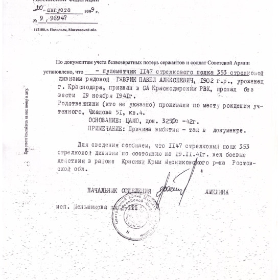 Воевал в составе 1147 стрелкового полка. Был пулеметчиком. Служащий нефтеперегонного завода г.Краснодара. Прекрасный семьянин. Женат, воспитал четверых детей.