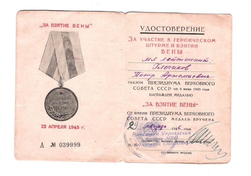 Глечиков Петр Петрович в 1941 году добровольцем ушёл на фронт через Шелаболихинский РВК Алтайского края. Принимал участие в боевых действиях в составе 3-ого Украинского фронта 9-й Гвардейской армии. При освобождении населённого пункта Шикатор (Венгрия) в составе 3-й роты стрелкового батальона 345 Гвардейского стрелкового полка за личный боевой подвиг и мобилизацию личного состава на разгром противника награждён орденом Красной Звезды.