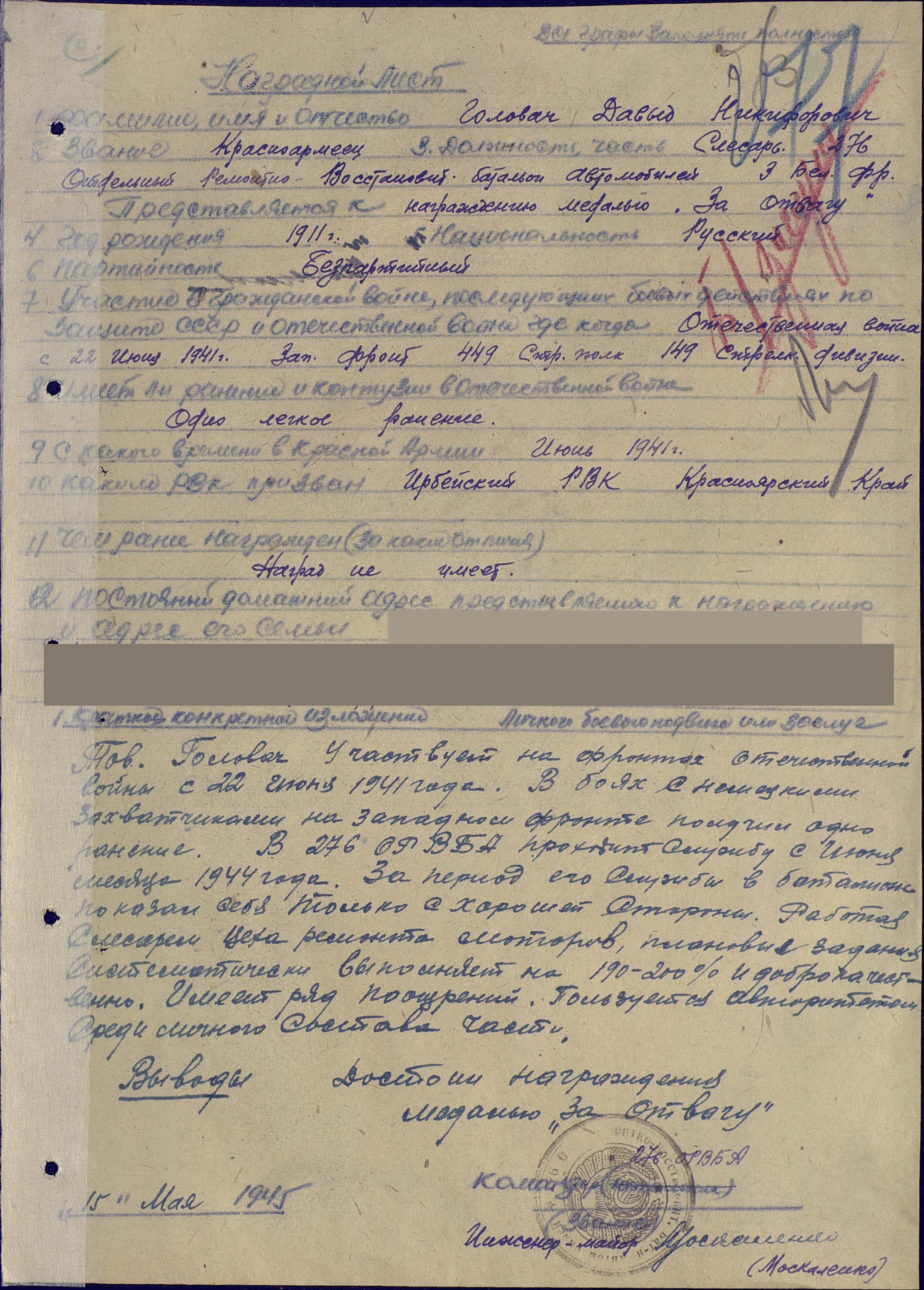 Медаль «За боевые заслуги»14.06.1945 - 14.06.1945