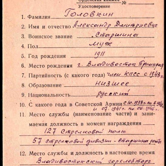 Проходил службу по призыву в городе Сретенске. Женился на Шереметьевой Марии Сергеевне. Семья уехала служить в Монголию. Спустя годы переехали в город Владивосток. В годы войны воевал на разных фронтах. Родилось четверо детей. В мирное время Александр Дмитриевич работал столяром на хлебозаводе. Имеел награды (медали): - "За победу над Японией"; - "За отвагу"; - "За победу над Халхин-Голом". Похоронен на морском кладбище в городе Владивостоке.