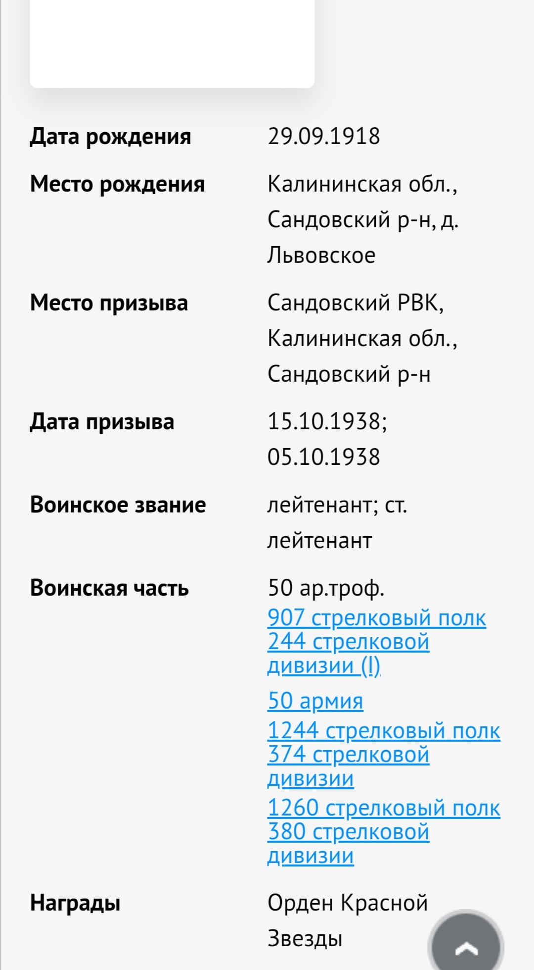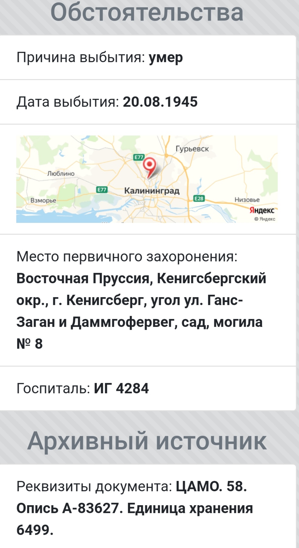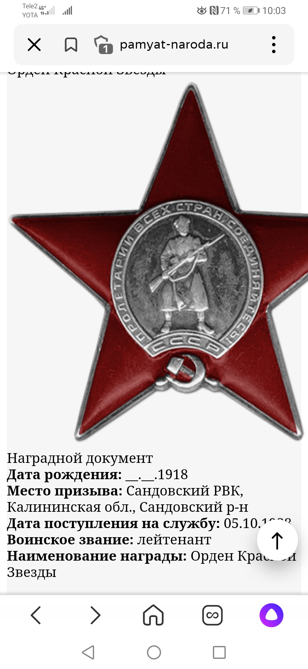 9 Мая! День Победы! Сколько их полегло, Сколько их не вернулось с войны. Память будет жива! Сохраним ваши подвиги, деды! Огонёк благодарности в наших сердцах Вечно будет пылать неазирая на годы! Наш прадедушка - Голубков Сергей Иванович, родился 29 сентября 1918 года в д. Львовское Сандовского района Калининской обл. в крестьянской семье. Его мать —деревенская женщина, Прасковья Григорьевна, была женщиной доброй, сдержанной и справедливой. Эти качества унаследовал сын Сереженька, так ласково называли его в семье. В 1942 году он пришёл на побывку, всего на один день. Четыре младшие сестры радостно встретили Сереженьку, и ещё потом долго вспоминали о вкусной большой буханке белого хлеба, которую он им принёс как гостинец. Рос обычным мальчишкой. Летом босиком бегал по мокрой траве, а зимой, обев батин тулуп да валенцы бежал кататься на санках. В 1938 году 5 октября был призван воевать Воинское звание - офицер, старший лейтенант. Был представлен к награде "Орден Красной Звезды" В наградном листе написано: "За время пребывания в батальоне в должности командира взвода, Голубков показал себя грамотным, дисциплинированным офицером. В период наступательных боёв, находясь в головной группе, проявил отвагу в сохранении под огнём противника складов трофейного имущества... " В последующем разминировал объекты и выполнял боевые задания на 120 - 150%(цитата из наградного листа). Инициативен, делу партии Ленина-Сталина предан. Идеологически выдержан. Достоен правительственной награды -Орден Красной Звезды". 18-20мая1945г при разминировании Сергей Иванович получил осколочное ранение, от которого 20 августа 1945г умер в госпитале. Захоронен в Восточной Пруссии в городе Кёнигсберге .Нет той семьи, Убежавшей от горя. От наглой войны, Ворвавшись как буря. Семьи крушила. Деревни спалила. В округе все в пепел Вмиг превратила. Но русский солдат Не дрогнул в бою. Русский солдат Отбил ту войну. На страже стоял. Защиту держал. Нам мирное время Он завещал. Храните потомки Мир на Земле. Ворота закройте Той наглой войне