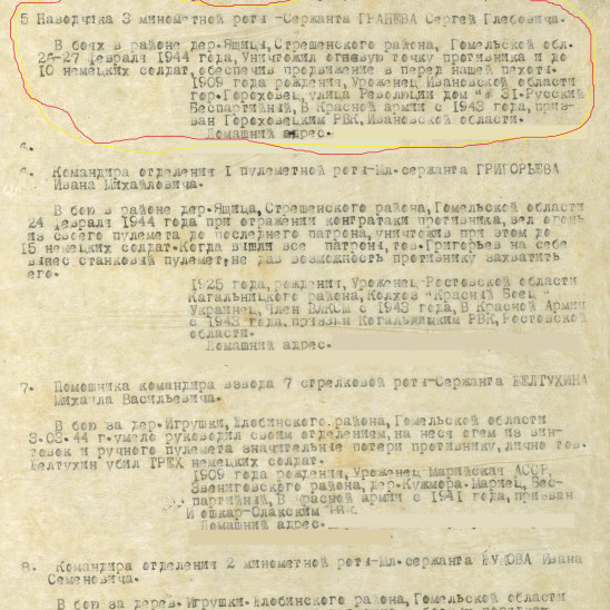 Это родной дядя моей мамы. Закончил церковно-приходскую школу. Повзрослев, пошел работать на Гороховецкий судостроительный завод. С первых же дней войны завод стал номерным, т.к. выпускались и корабли и снаряды для нужд Красной армии. У Сергея Глебовича была бронь, но в 1943 году ушел добровольно на фронт, оставив жену и трехлетнюю дочь, которую от самого дома и до призывного пункта нес на руках.. Он не вернулся.