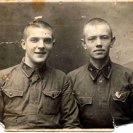 В самом начале войны 22.06.1941 года он был призван на фронт. Фотокарточка сделана в день отправки - 22.06.1941 и прошла с ним все тягости войны (дедушка на фото слева). В 1942 году он был контужен и отправлен в Ленинград, где отказавшись от инвалидности защищал, а потом и участвовал в восстановление города. Он не очень любил вспоминать про войну, ему было страшно. Но он очень любил этот великий праздник и всегда плакал в этот день.