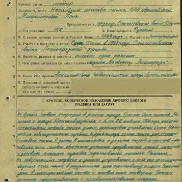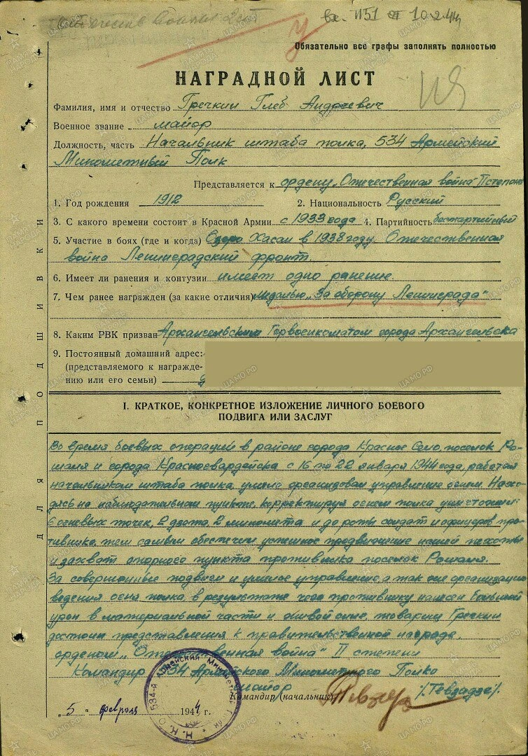 Я хотел рассказать о моём прадеде Гречкине Глебе Андреевече Мой прадед Гречкин Глеб Андреевич родился 10 мая 1912г.в г. Пугачёве Саратовской обл.Закончил 1-ю Ленинградскую артиллерийскую школу командного состава имени"Красного Октября".Свою службу начал в г.Архангельске с 1931г .В 1937 г.ему. было выдано удостоверение в том,что он состоит на действительной военной службе в кадрах Рабоче-Крестьянской Красной армии в должности лейтенанта.Какое то время преподавал в артиллерийской школе в г. Ленинграде Затем был призван на фронт на защиту Родины.Принимал участие в различных боевых действиях и операциях (Красносельско-Ропшинская операция и развитие её на Псков, Псковская наступательная операция, и др.) в составе 42А при обороне западных и юго - западных подступах к Ленинграду.Был назначен на должность начальника штаба в/ч №67602 в звании майора .В 1944 году при очередной наступительной операции был смертельно ранен. За время службы был награждён Орденом Красной Звезды , Орденом Отечественной Войны второй степени, Медалью "За Оборону Ленинграда". В бою за Родину проявив геройство и мужество был убит 27 июня 1944 года, место захоронения братская могила в городе Выборге.