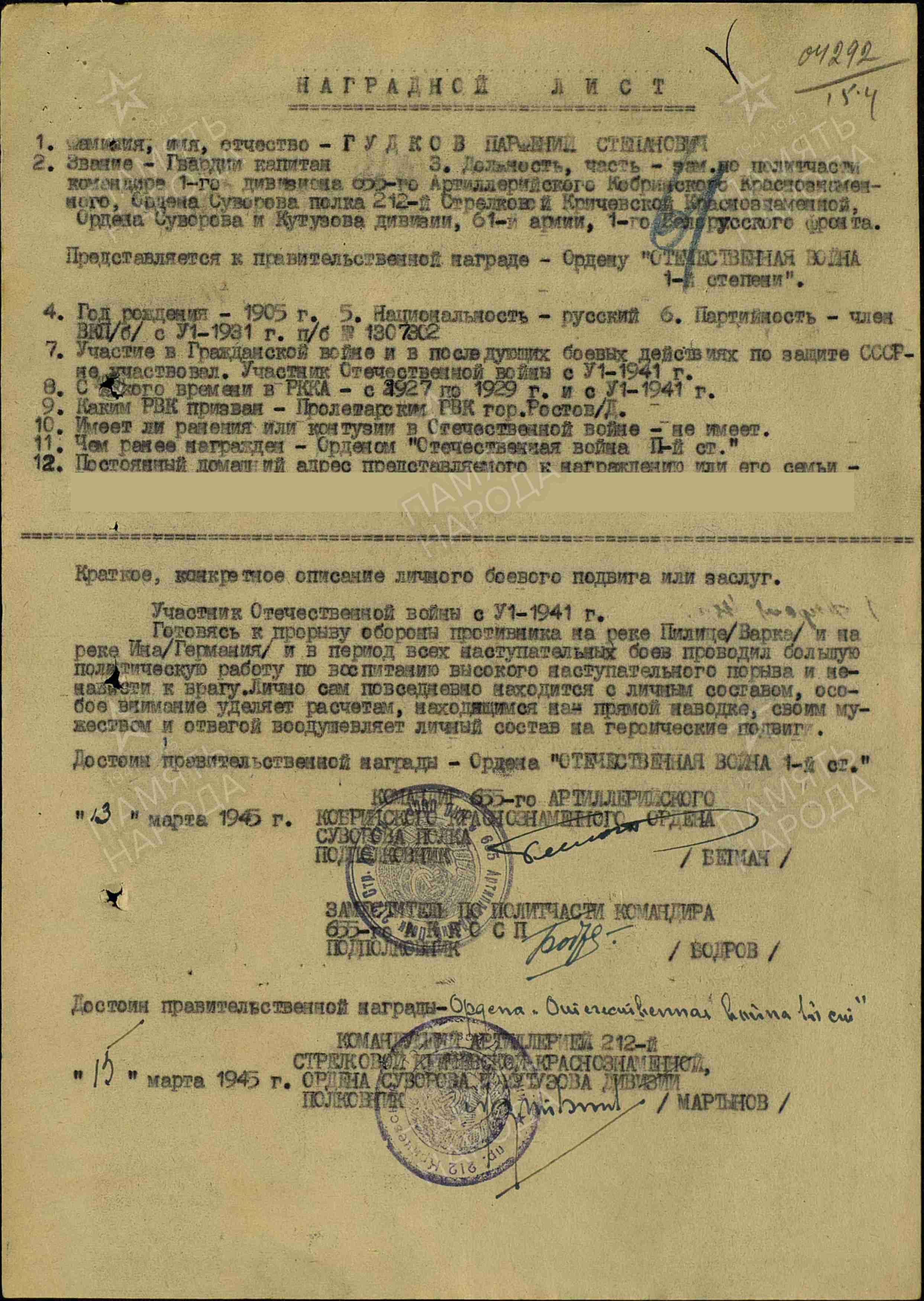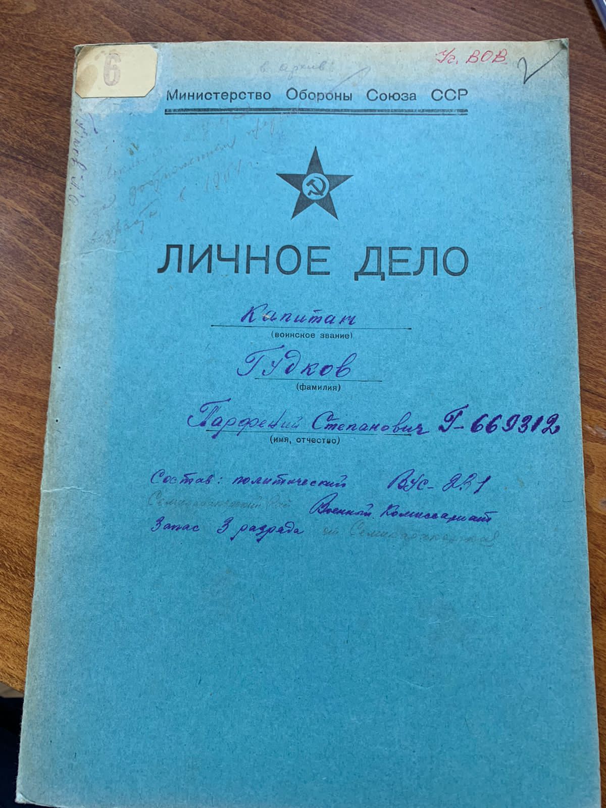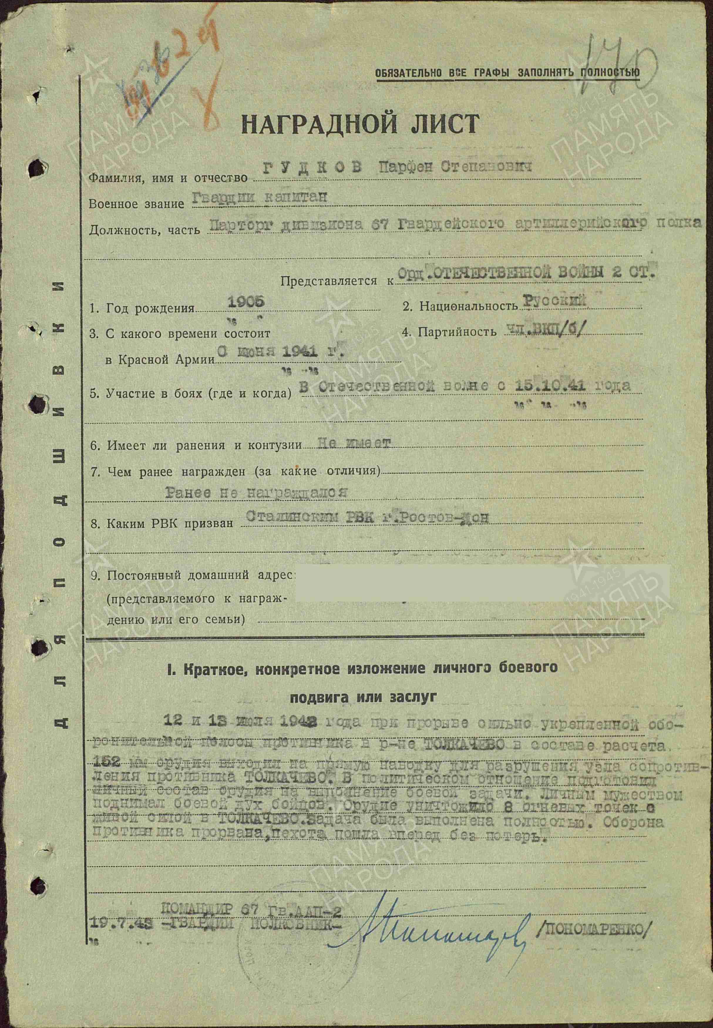 К сожалению, я не застал при жизни своего дедушку Гудкова Парфения Степановича, он умер в 1972 году. О его жизни мне было известно со слов отца и бабушки. Они с самого детства прививали мне уважение к предкам и любовь к Родине. Каждый год я, вместе с семьей посещаем кладбище, расположенное в Ростовской области на котором похоронен дедушка. При жизни прадед не любил говорить о войне и о его подвигах нам стало известно уже после смерти. Несколько лет назад я стал заниматься сбором информации о жизни и службе в годы Великой Отечественной войны своего дедушки: делал запросы в государственные ведомства, посещал архивы Министерства обороны и речного флота, где дедушка служил после войны, изучал сохранившиеся документы, архивные справки и журналы боевых действий дивизий, в которых он служил, открытые источники и даже совершил поездку в родную деревню своего дедушки, в Смоленскую область, где удалось найти своих родственников, а в доме в котором проживал дед, в настоящее время создан музей русской старины. Выяснилось, что дедушка прошел большой и тяжелый боевой путь: с первых дней и до последних находился на фронте, от рядового дослужился до звания гвардии капитана, от должности рядового разведчика до заместителя командира дивизиона по политчасти, в начале войны из окружения под Москвой с боем пробивался к своим, а в конце войны был ранен вражеским огнем при наступлении уже на территории Германии. За совершенные подвиги, проявленное мужество и героизм неоднократно награждался правительственными наградами: Орденами Великой Отечественной войны 1 и 2 степени, медалью «За оборону Москвы», медалью «За победу над Германией в Великой Отечественной войне 1941-1945 гг.». Как важно нам, предкам народа-победителя знать и передавать сведения о войне последующим поколениям, особенного в условиях современного мира, когда заслуги нашего народа, имевшие решающее значение в деле победы над фашизмом пытаются принизить или стереть из мировой истории. Мой дедушка родился 20 февраля 1905 года в деревне Барсуки, Всходского района Смоленской области в семье крестьянина середняка. Имел 6 родных братьев и сестру. В детстве окончил сельскую школу, а затем работал в своем хозяйстве до ноября 1927 года, когда был призван на службу в Красную Армию. Служба его проходила в городе Смоленске в артиллерийском полку в должности командира отделения разведки. После демобилизации выехал в город Ростов-на-Дону, где поступил на службу в отряд охраны путей и сообщений в качестве стрелка, а затем служил на командирских должностях в образовавшемся Народном комиссариате водного транспорта. Окончил вечерний рабфак финансово-экономического института, женился, воспитывал трех детей. С первых дней войны, 23 июня 1941 года мой дедушка был мобилизован на фронт в качестве рядового разведчика 138 Пушечного артиллерийского полка. Окончив мобилизационные мероприятия, полк начал погружаться на фронт и уже 29 июня 1941 года со станции Нахичевань-Донская были отправлены первые эшелоны. Вот так живо и почти поэтично было описано начало движения полка в сторону фронта в начале войны в журнале боевых действий: «Оставив прирусловые долины достопримечательного Дона, через угольные шахты Донбасса, цветущие поля Украины и полные шума Брянские хвойные леса проложили путь эшелоны нашего полка. И всюду, на б