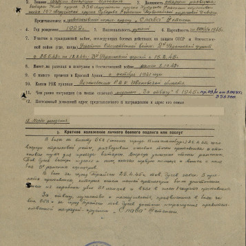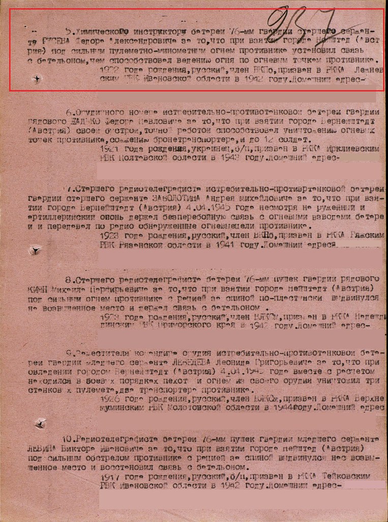 "В боях за высоту 568 (Южнее города Вильгельмсбург) 26.04.45 шел впереди стрелковой роты, разведывал огневые точки противника и отыскивал путь для проезда батареи. Впереди услышал стоны раненых. Товарищ Гусев быстро подполз к ним, оказав первую помощь и вынес с поля боя 3-х раненых офицеров