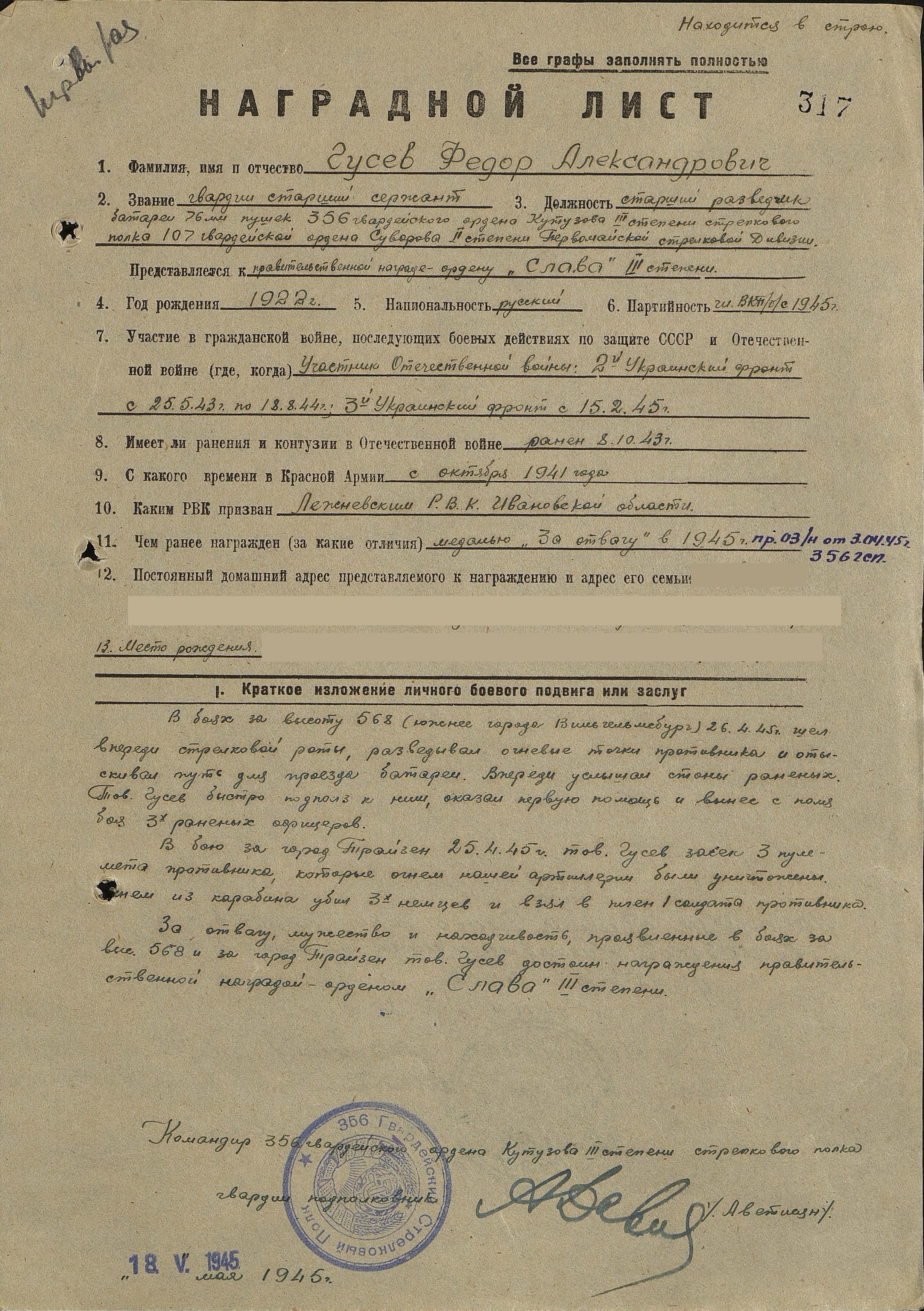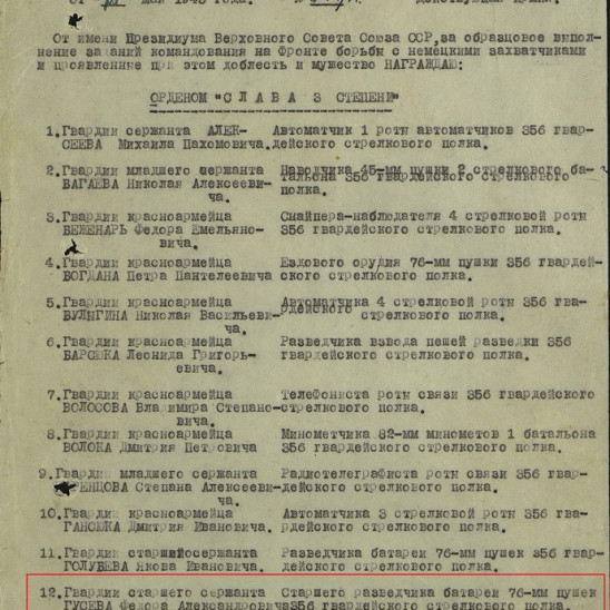 Гусев Фёдор Александрович был Гвардии старшим сержантом в должности старшего разведчика батареи 76 мм пушек 356 гвардейского ордена Кутузова 3 степени стрелкового полка 107 гвардейской ордена Суворова 2 степени Первомайской стрелвковой дивизии. Был участником Второго Украинского фронта с 25.05.43 года по 18.08.44 года. А также участником третьего Украинсокго фронта с 15.02.45. Был ранен 08.10.43 года. Награжден медальлю "За Отвагу" 03.04.1945 за то, что при взятии города Нойштадт (Австрия) под сильным пулемётно-минометным огнем противника установил связь с батальоном, чем способствовал ведению огня по огневым точкам противника.