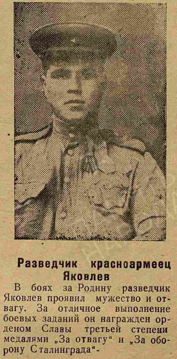 Яковлев Михаил Сафонович 09.10.1924 — 25.10.1999 Рядовой разведчик наблюдатель взвода разведки батареи управления 11 артдивизии Место рождения Липецкая обл., Чаплыгинский р-н, с. Кривополянье ; Рязанская обл., Раненбургский р-н Место призыва Раненбургский РВК, Рязанская обл., Раненбургский р-н Воинское звание красноармеец ; рядовой Воинская часть 11 артиллерийская дивизия Награды Медаль «За оборону Сталинграда» Медаль «За отвагу» №: 10/н от: 29.04.1944 Издан: 11 артд 7 гв. А 2 Украинского фронта Орден Славы III степени №: 32/н от: 08.09.1944 Издан: 11 артд РГК Орден Отечественной войны I степени 06.04.1985 (Липецкая обл., Чаплыгинский р-н, с. Кривополяние)