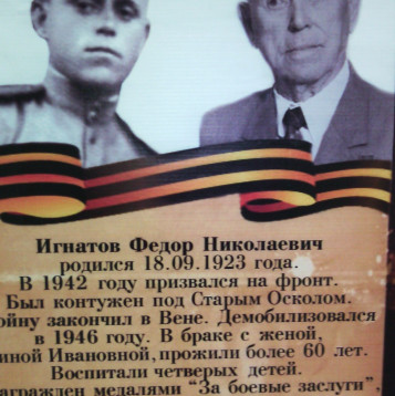 Фёдор Николаевич Игнатов родился 23 сентября 1923 года в с. Пертово, Рязанской области. В 1939 году семья переехала по переселению на Дальний Восток, в с. Потехино, Амурской области. В 1940 году он поступил в Сретенский сельскохозяйственный техникум. В феврале 1942 г. был призван в ряды РКА, через 4 месяца попал на фронт. Воевал на Степном и Воронежском фронтах. В 1943 г. был контужен. После госпиталя попал на 2-й украинский фронт. Победу встретил в Австрии (с. Лоа, в 40 км от Вены). Демобилизовался в октябре 1945 года. После окончания в 1947 г. техникума работал главным агрономом Потехинской МТС. В 1951 году женился. Жена Нина Ивановна Игнатова (Кадочникова), работала учителем начальных классов. С 1958 по 1961 год - главный агроном инспекции сельского хозяйства Зейского района Амурской области. С 1961 и до 1999 года- главный агроном совхоза "Зейский" в с. Овсянка. Член Зейского Совета ветеранов. У Фёдора Николаевича четверо детей, 7 внуков и 7 правнуков. С женой прожили 62 года.