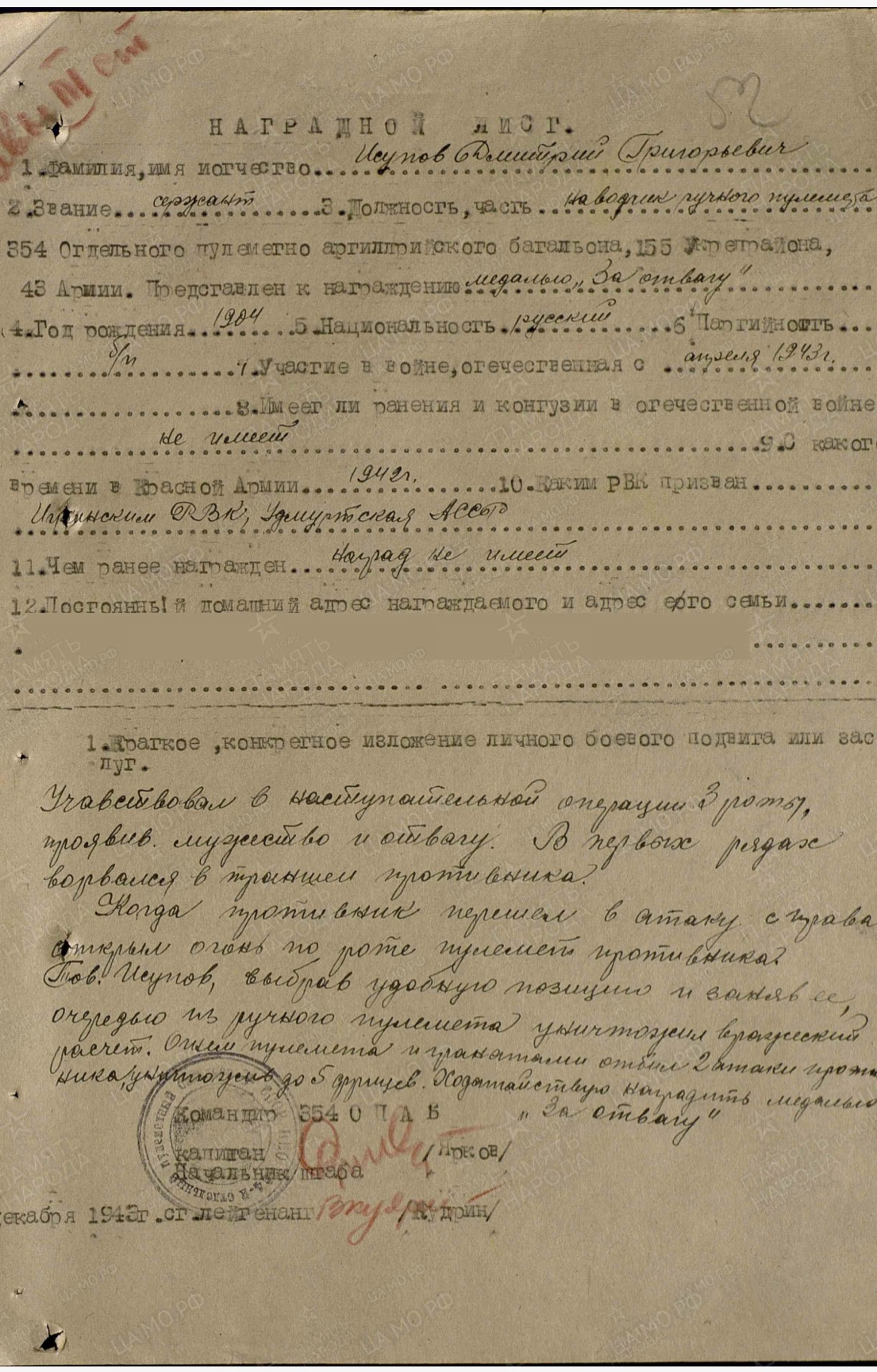 Воевал в составе 354 Отдельный пулеметно артиллерийский батальон, 155 Укрепрайон-Волоколамский, 43 Армии. Награжден медалью «За отвагу». Погиб 02.07.1944. Захоронен Братский мемориал Белоруссия Витебская обл., Полоцкий р-н, д. Юровичи.