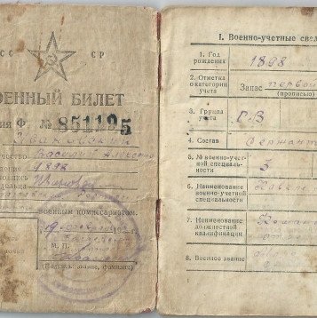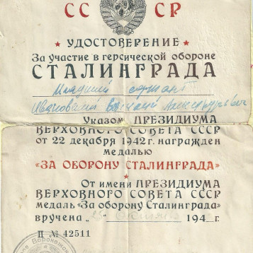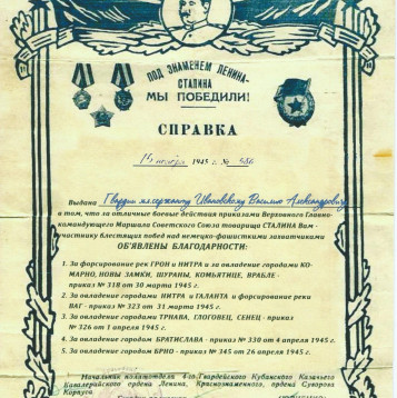 Родился в хуторе Арпачин, в многодетной семье бедного казака. Рано остался без отца, был старшим в семье из 4-х человек. Окончил два класса церковно-приходской школы. В 1917г. попал на фронт первой мировой войны и вернулся домой живым в 1919г. Был награжден георгиевским крестом 4-ой степени! Уходя на войну в 1941г. оставил дома супругу Ивановскую Марию Гавриловну и пятерых детей: Александра, Степана, Надежду, Тамару и маленькую Лидочку. Попал служить под Сталинград в 840-й батальон аэродромного обслуживания, где получил медаль за оборону Сталинграда. Позже, в 1943г. попал в госпиталь, после лечения и до конца войны воевал в 40-ом гвардейском казачем кавалерийском полку, 10-ой гвардейской казачий кавалерийской дивизии, 4-ого гвардейского казачего кавалерийского корпуса. Участвовал в освобождении Украины, г. Одессы, Белоруссии. И особо отличился при освобождении Чехословакии, за что был награжден медалью за отвагу и 5-ю благодарностями от верховного главнокомандующего маршала Сталина И.В. Войну закончил 10 мая под Прагой. Вернулся домой в июле 1945г. После войны у Василия родился еще один сын Петр. В возрасте 95 лет скончался.