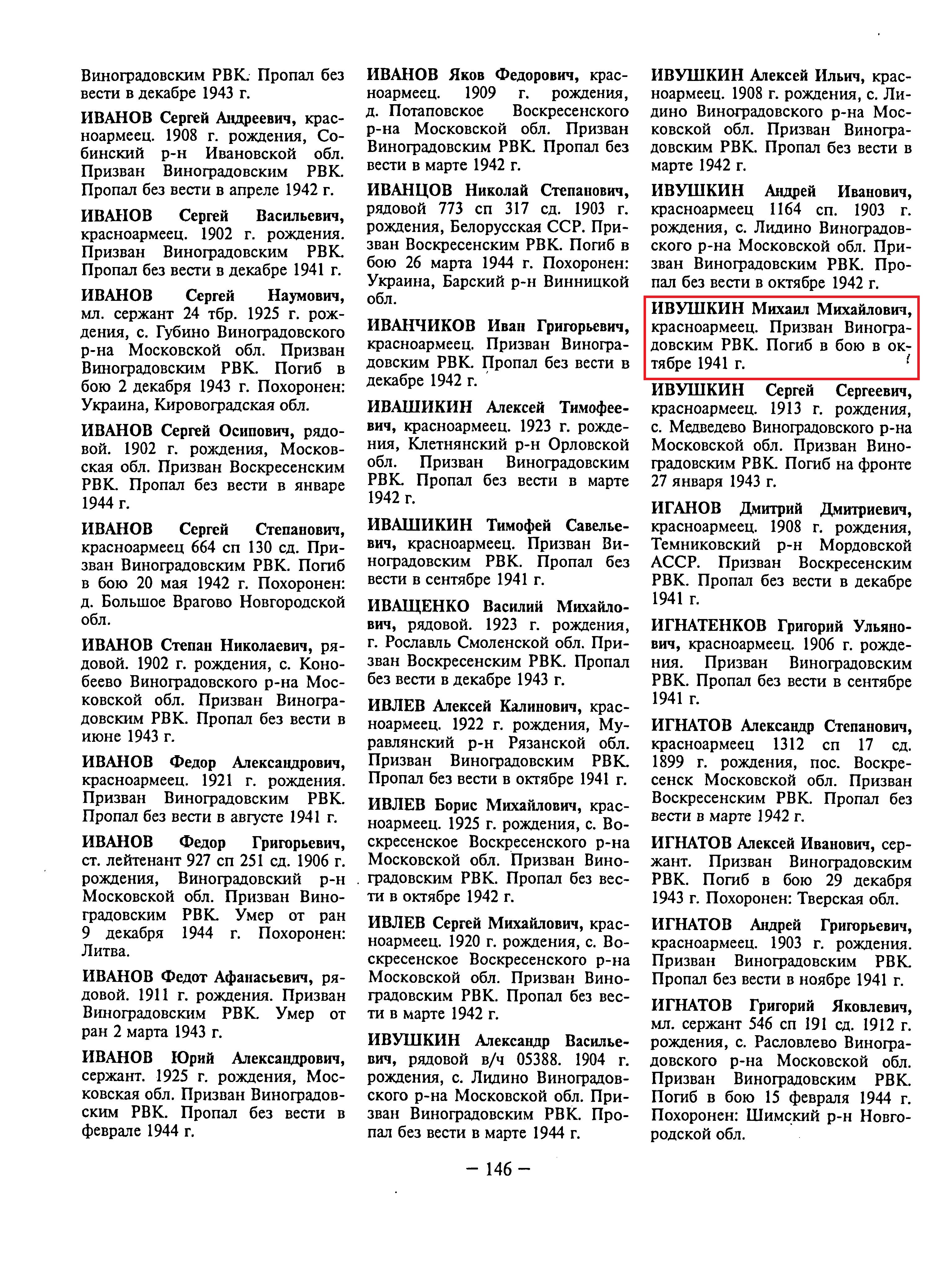 Боевой путь ветерана Мой дед - Ивушкин Михаил Михайлович 1911 г.р. . Участник Советско – Финской войны 1939-40 года. Был ранен. С началом ВОВ, призван Виноградовским РВК Московской области в июне 1941 года. С октября 1941 года числился без вести пропавшим. В 1943 году, после освобождения Брянской области, пришло письмо от местного жителя , в  котором  он сообщил о гибели моего деда и где похоронил его.
