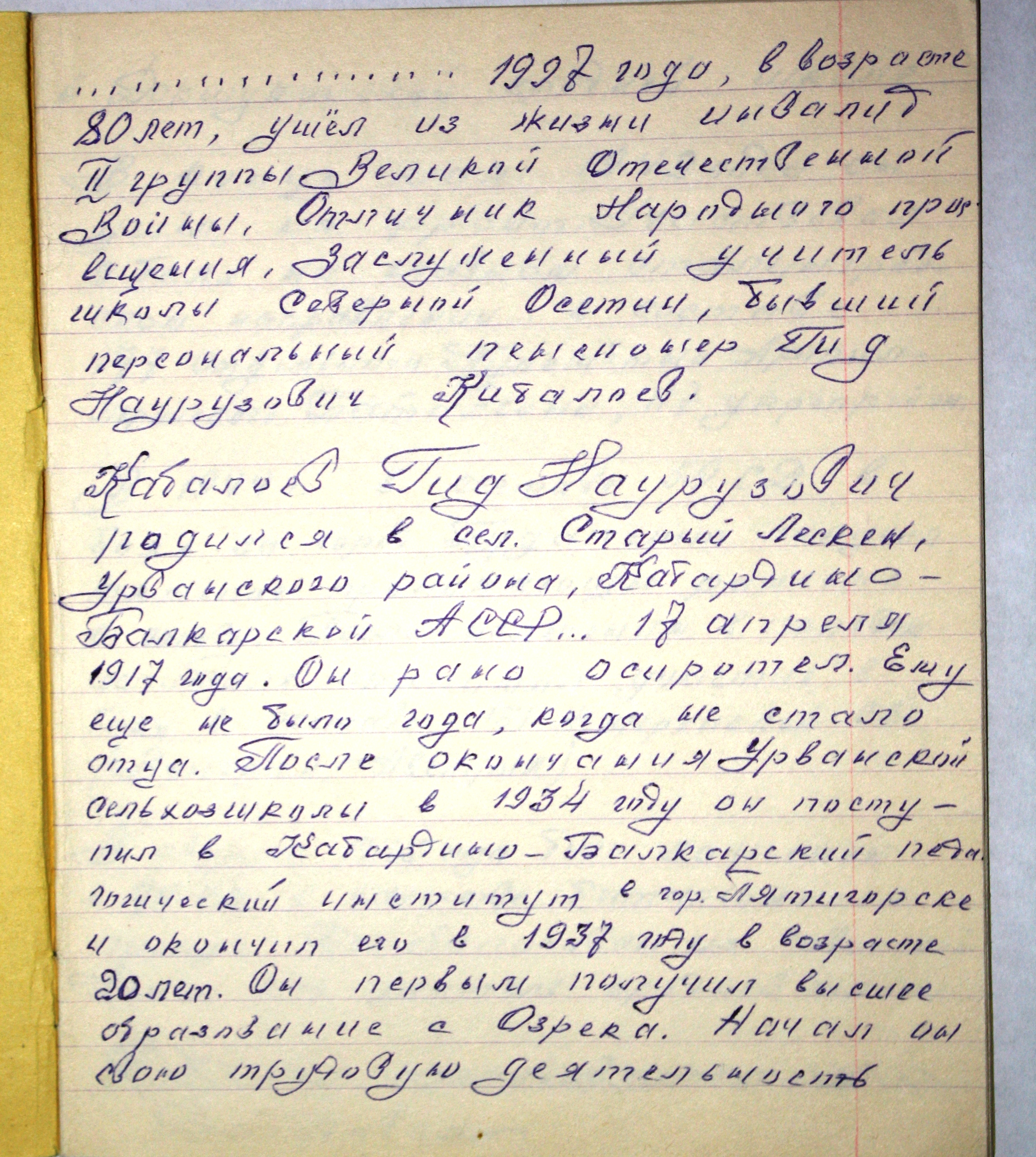 Кабалоев Гид Наурузович, родился 17 апреля 1917 года в Российской Империи в Нальчикском округе, Терской Области (селение Старый лескен, Урванского района, Кабардино - Балкарской АССР), в семье крестьянина-середняка (кулака). Отец Науруз Гуаджиевич Кабалоев (1986 года рождения) погиб в 1918 году при столкновении с Красными бандами под Старым Лескеном. У семьи отняли львинную долю имущества, в результате, семья переехала в селение Озрек (Лескенский район КБР). 1930 год Гид Наурузович окончил Озрекскую начальную школу.1932 год окончил Урванскую Сельхоз - школу. 1934 год поступил в Педагогический институт в городе Пятигорск. Мать Гида Дзагурова умерла в 1937 году. Семью постигла репрессия, лишив всю семью имущества жилья и средств для существования.1937 год окончил Педагогический институт. С 1 сентября по 30 мая 1942 года работал преподавателем математики Докшукинской средней школы в городе Докшукино. 1942 год. 30 мая был мобилизован в Красную Армию.