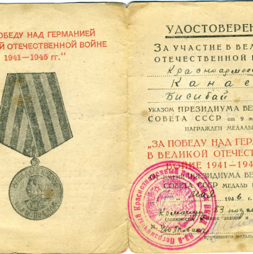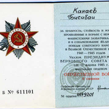 Родился в 1912 году (день и месяц не известны) на территории Западно-Казахстана России. Был призван в армию в 1934 году. Участник Великой Отечественной Войны с 1941 по 1945, Победу встретил в Германии в городе Зуль. Службу закончил в сентябре 1947 г. Перед войной проживал в с. Бирлик Бурсынского сельского совета Джаныбекского района Западно-Казахстанской области, откуда был призван 05.03.1941 года в армию из запаса. Служить начал рядовым в составе 83 Пограничного Краснознаменного полка войск НКВД. Снят с воинского учета по достижении предельного возраста 21.01.1963 года. После демобилизации проживал в Казахской ССР, а в 1953 г. переехал в с. Савинка (в настоящее время Палласовский район Волгоградской области). Был членом колхоза, реорганизованного в дальнейшем в совхоз им. Чапаева, работал в животноводстве. На пенсию вышел 05.05.1972 года. Был женат. Супруга Канаева Кульмай (1913-1992) работала также в сфере животноводства. Единственный сын – Ермек (1948-2023) – работал педиатром и рентгенологом в ГБУЗ «Палласовская ЦРБ» с 1973 по 2023 годы. Канаев Бисибай ушел из жизни 10.08.1989 г. в городе Палласовке. Похоронен в мусульманской части городского кладбища. Воспоминаний о войне не оставил. Удостоверение Ветерана Великой Отечественной войны от 21.10.1980 г. № 598664. Награды Канаева Бисибая: - медаль «За победу над Германией в Великой Отечественной войне 1941–1945 гг.» - Указ Президиума Верховного Совета СССР от 09.05.1945 - вручена 07.05.1946 полковником 83-го Пограничного Краснознаменного полка войск НКВД Целиковым (удостоверение Щ № 170380); - медаль «За боевые заслуги» – Указ Президиума Верховного Совета от 17.10.1938 г. Об учреждении медали «За боевые заслуги» - вручена 12.08.1946 г. (удостоверение № 763918, медаль № 2370480); Информация о награде Канаева Бисибая (с опечаткой в имени) отражена на сайте https://podvignaroda.ru/ : https://podvignaroda.ru/?#id=43966389&tab=navDetailManAward Выписка из Наградного листа: «Краткое конкретное изложение личного боевого подвига или заслуг: С начала отечественной войны участвовал в боях на подступах к городу Ленинграду в составе 161 армии, где показал образцы храбрости и мужества своей Родины. Отражая контратаку немцев, в одном из боев лично из своей винтовки уничтожил 9 немцев и вынес с поля боя 2-х раненых командиров. Неся службу в войсках НКВД, службу по охране тыла знает и несет ее на высоком уровне. Достоин представления к Правительственной награде медали «ЗА ОТВАГУ» Командир 83 Краснознаменного погранполка войск НКВД Полковник Целиков 31 мая 1945 года». А также: - орден Великой Отечественной войны II степени - Указ Президиума Верховного Совета СССР от 11.03.1985 г. (номер ордена № 4479201, удостоверение Б № 611101); - Знак «25 лет Победы в Великой Отечественной Войне» - № 34 - Приказ МО СССР (Гречко А.А.) № 59 от 17 марта 1970 года; - юбилейная медаль «30 лет Победы в Великой Отечественной Войне 1941–1945 гг.» от 08.05.1976 г. - Указ Президиума Верховного Совета СССР; - юбилейная медаль «40 лет Победы в Великой Отечественной Войне 1941–1945 гг.» от 07.05.1985 г. - Указ Президиума Верховного Совета СССР от 12.04.1985 г.; - юбилейная медаль «60 лет Вооруженных Сил СССР» - Указ Президиума Верховного Совета СССР от 28.01.1978 г.; - юбилейная медаль «70 лет Вооруженных Сил СССР» - Указ Президиума Верховного Совета СССР от 28.01.1988 г.