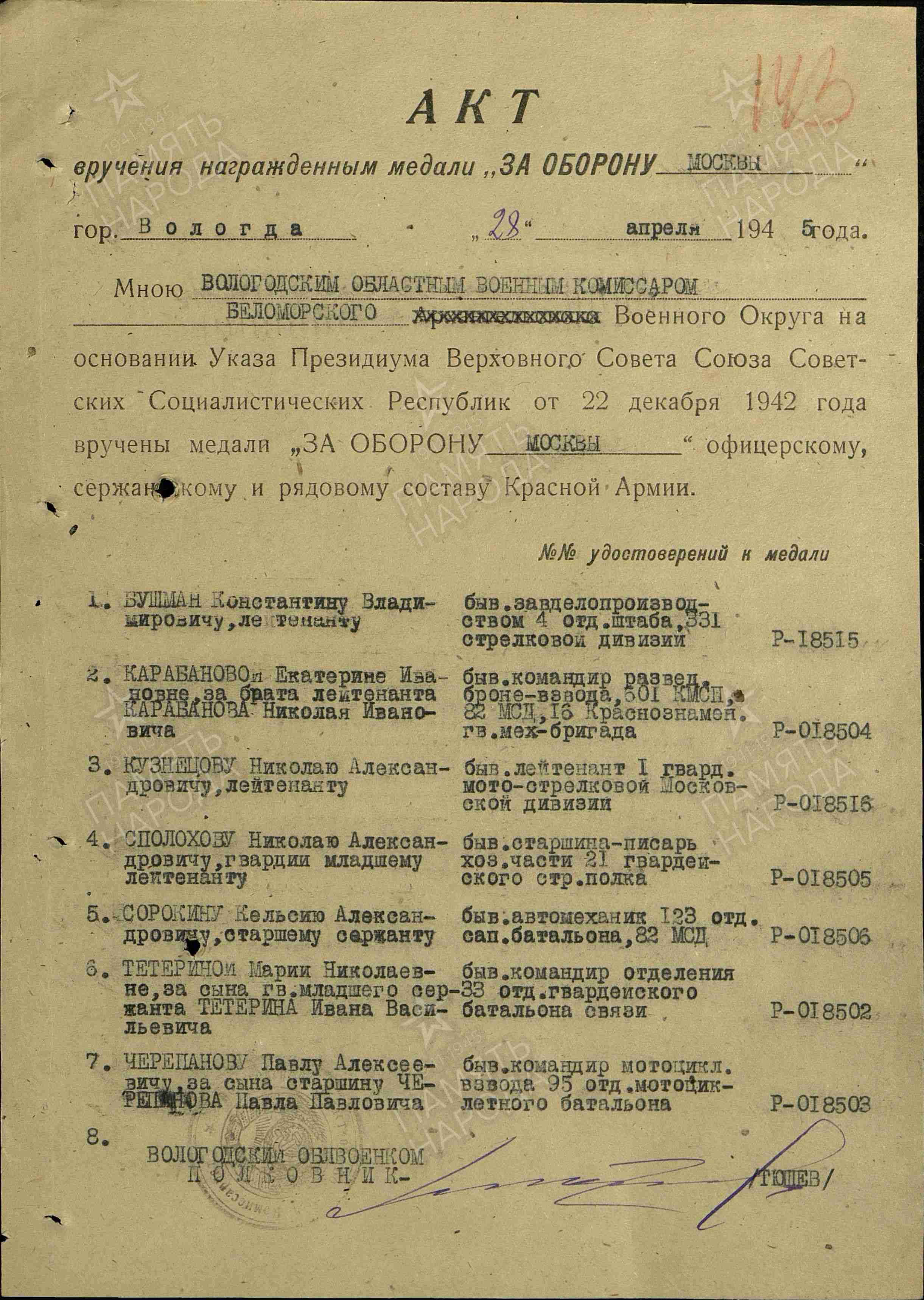 Мой троюродный прадед Карабанов Николай Иванович, родился 22.05.1920 года в селе Воскресенское Петриневского (ныне Череповецкого) Вологодской области, из крестьян, образование – 8 классов средней школы, член ВЛКСМ с 1935 года. Отец его - Карабанов Иван Николаевич работал председателем колхоза имени Сталина в с. Воскресенском, мать - Карабанова Павла Григорьевна, сестра - Карабанова Екатерина Ивановна, 1921 г.р. В 1937 году Николай поступил в Бронетанковое училище им. Сталина, в 1939 году окончил училище, присвоено звание лейтенант, с 05.04.1940 – командир разведывательного взвода, с 04.04.1941 – командир взвода бронемашин, с 07.08.1941 года - командир разведывательного взвода. Участвовал в битве за Москву в составе 601 мотострелкового полка 82 мотострелковой дивизии, 16 Краснознаменной гвардейской мех-бригады. Убит в бою 30.10.1941 года в районе ст. Дорохово Московской области, похоронен - мемориал на ст. Дорохово Рузского района Московская область (https://pamyat-naroda.ru/heroes/memorial-chelovek_donesenie53361233/), занесен в Книгу памяти «Они погибли в битве под Москвой» (основание – ФБУ ЦАМО РФ ф. 33 оп.11458 д. 78 л. 312 № 2) (https://pamyat-naroda.ru/heroes/memorial-chelovek_pechatnoi_knigi_pamyati1052330410). Награжден медалью «За оборону Москвы» (№ удостоверения Р-018504), медаль вручена сестре Карабановой Екатерине Ивановне 28.04.1945 года (https://pamyat-naroda.ru/heroes/podvig-chelovek_nagrazhdenie1531083130). На момент гибели Карабанову Н.И. был 21 год, до поступления на военную службу не успел создать семью, у него не осталось детей. У его сестры – Карабановой Е.И. также не было детей. Первоначальные очень скудные сведения о Николае Ивановиче были получены мною от моей матери, а затем на основании этих сведений более полные сведения были получены из открытых источников из сети «Интернет», а также в архивах – Государственный архив Вологодской области, Череповецком центре хранения документации (Вологодская область г. Череповец). После полученных сведений я рассказала родственникам и своим детям о Карабанове Н.И. Вечная память герою!