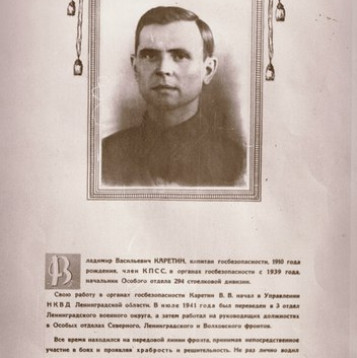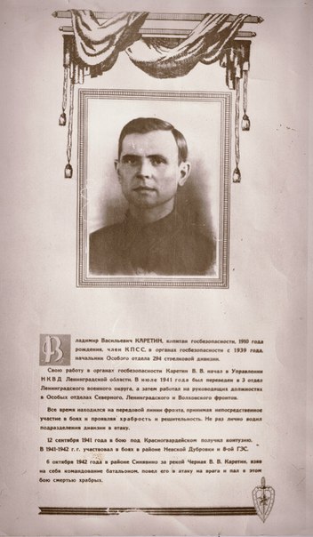 "Владимир Васильевич Каретин, капитан госбезопасности, 1910 года рождения, член КПСС, в органах госбезопасности с 1939 года, начальник Особого отдела 294 стрелковой дивизии.