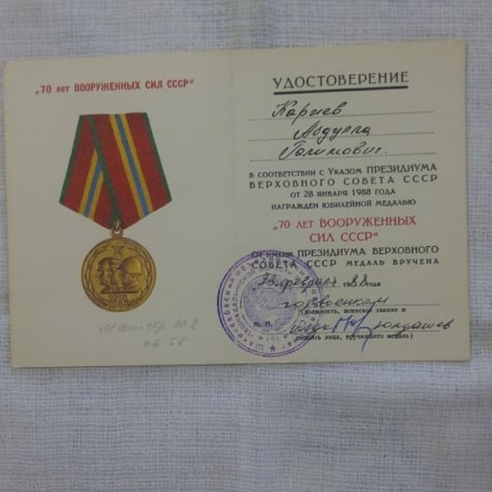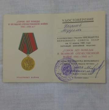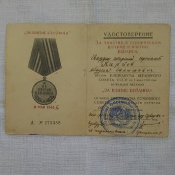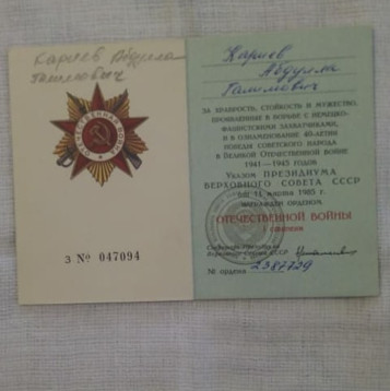 Мой дедушка гвардии старший сержант Кариев Абдулла Галимович (1916-1998г). Прошел всю войну 1941-1945г. Дошел до Берлина, ранен был два раза. Был награждён медалями: За взятие Берлина, За победу над Германией, За победу в Великой Отечественной Войне и ещё много разных наград