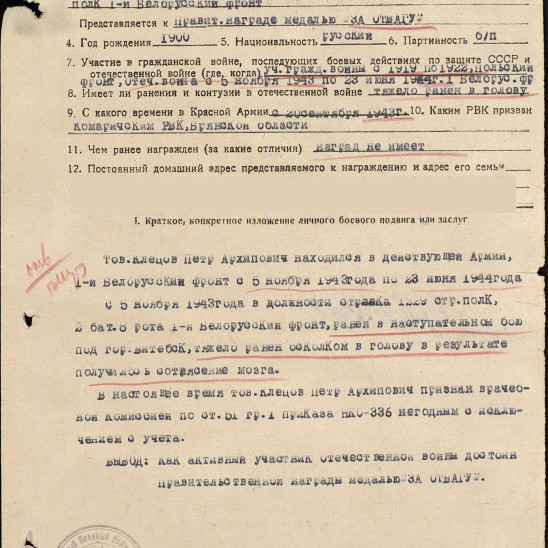 Воевал с 5.11.1943 г. по 23.06.1944 г. на 1 Белорусском фронте.