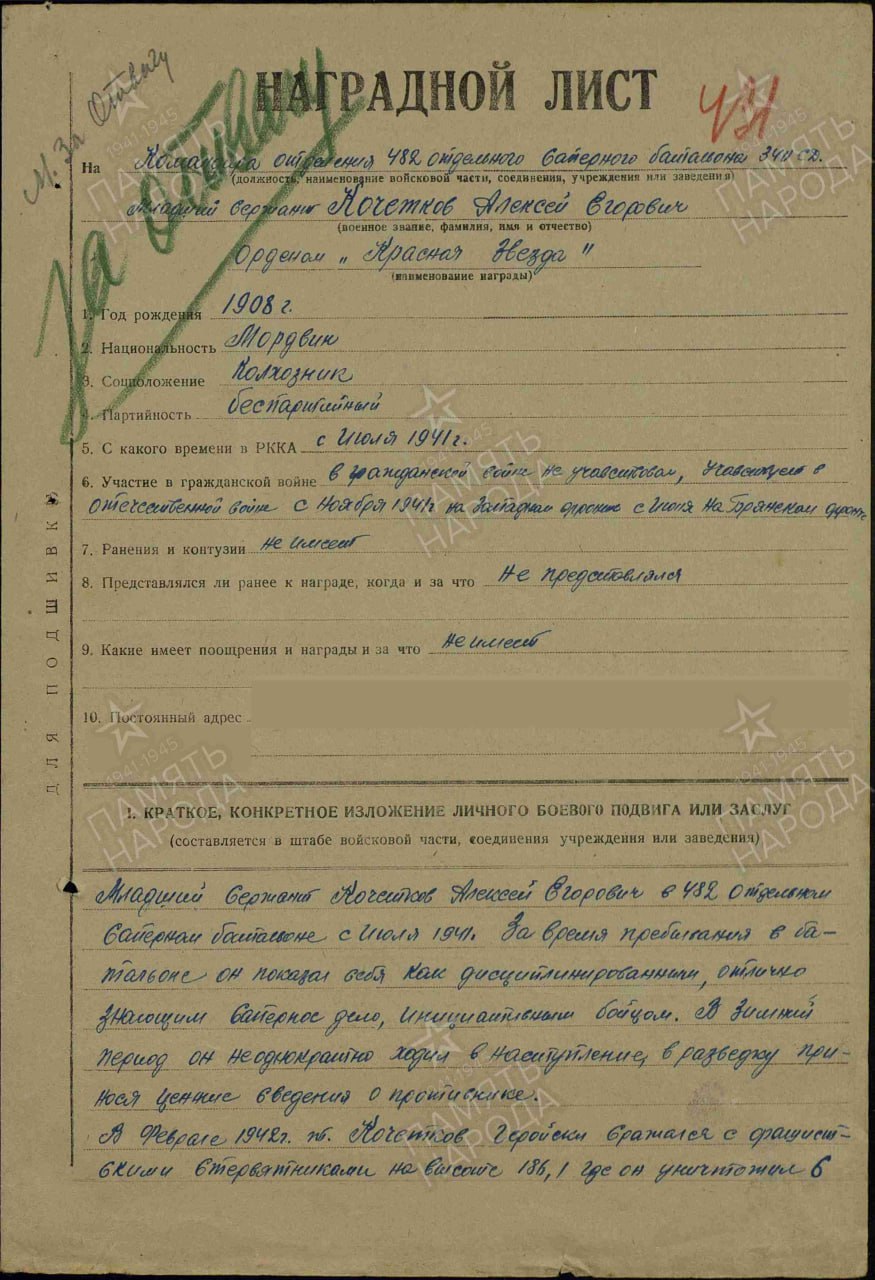 Младший сержант Алексей Егорович Кочетков воевал в 482 отдельном сапёрном батальоне с июля 1941 года. В зимний период он неоднократно ходил в разведку, принося ценные сведения о противнике. В феврале 1942 года Алексей Кочетков героически сражался с фашистами на высоте 186, 1, где уничтожил 6 фашистских стервятников. Награждён орденом Красной звезды, медалью “За отвагу”. Был тяжело ранен.