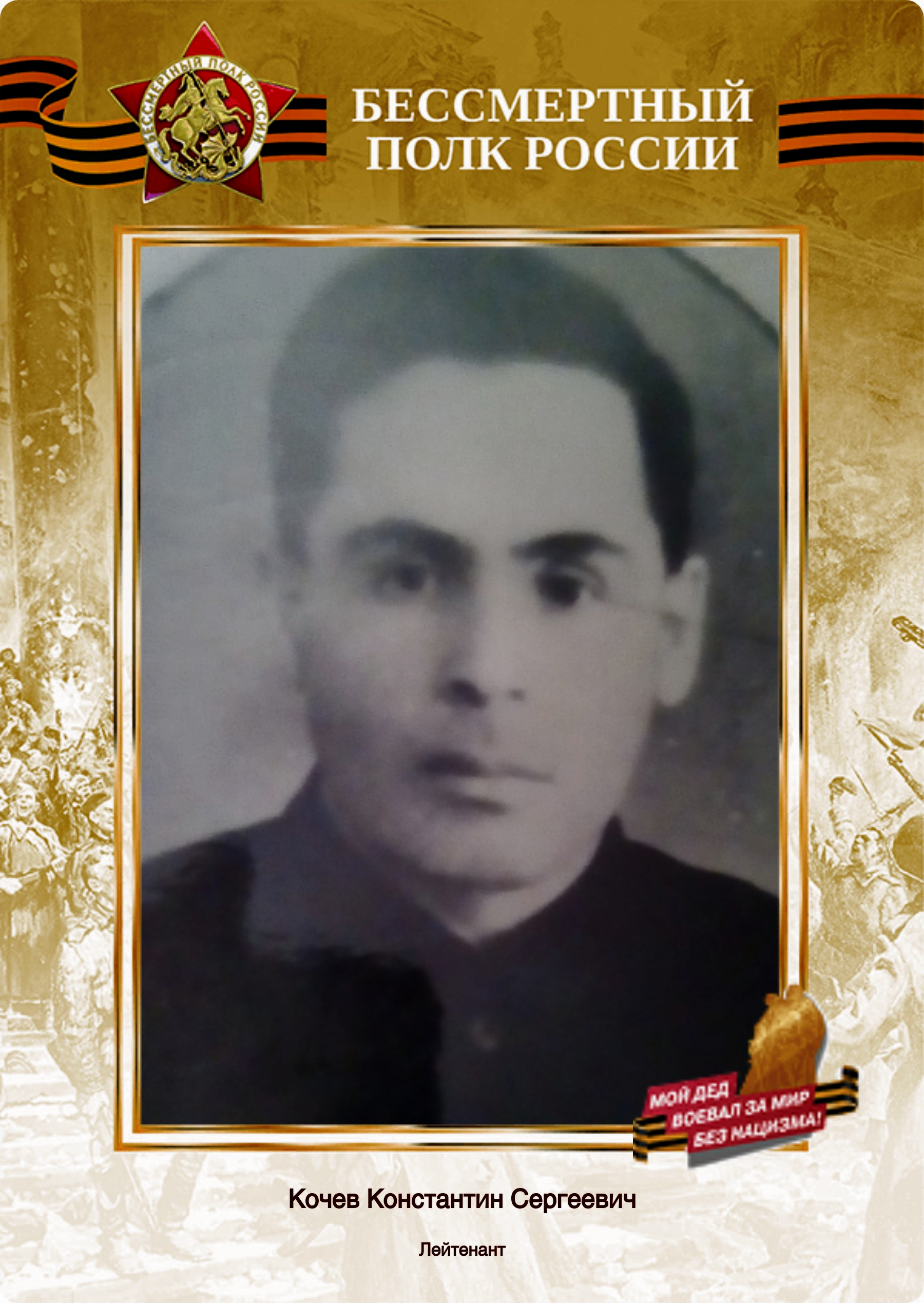 Кочев Константин Сергеевич родился в селе Тайна Газ-Заводского района в 1917 году. В 1942 году был призван на фронт. В боях под Ржевом был тяжело ранен, его отправили в госпиталь в г.Читу. После излечения в госпитале его комиссовали по состоянию здоровья и направили Председателем Колхоза в с.Батакан Газ-Заводского района. Затем он окончил СовПартШколу в г.Чита по ул.Анохина, где сейчас находится Читинский медицинский колледж. После этого был назначен инструктором районного комитета. В 1964 году тяжело заболел, отказали ноги из-за тяжёлого ранения, полученного на войне. Умер 26 августа 1966 года. Мой папа, Кочев Александр Константинович, рассказал про своего отца всё, что знает. Потому что мой дедушка служил в секретной части, о которой ничего неизвестно. Все данные засекречены и находятся в архиве в г.Подольске, об этом узнала моя тётя, Валентина Константиновна, дочь моего деда. Мы гордимся им!!!