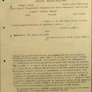 Кочкуров Василий Федорович кадровый офицер Красной Армии с 1932 г. , гвардии подполковник, политработник. Участвовал в вооруженном конфликте с милитаристской Японией у озера Хасан в Приморском крае в 1938 г. На фронтах Великой Отечественной войны с первых дней. Воевал под Мурманском, в блокадном Ленинграде, участвовал в освобождении Советской Украины, Молдавии, Румынии, Югославии. Заместитель начальника политического отдела 1 гвардейского укрепленного района 46 армии 2 Украинского фронта Кочкуров В.Ф. погиб в боях за освобождение города Будапешта 18 января 1945 года. Награжден орденами Красной звезды, Отечественной войны 2 степени, медалями "За боевые заслуги", "За оборону Ленинграда"