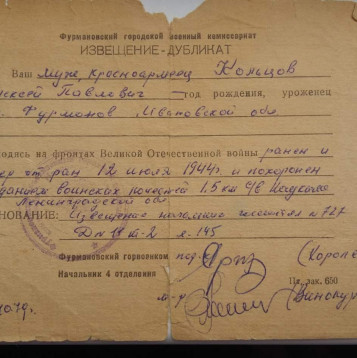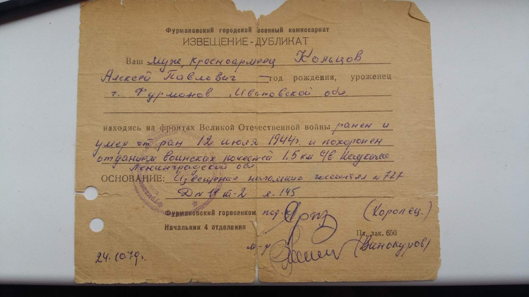 Был призван Фурмановским РВК Ивановской области. Ранен и умер от ран 12.07.1944. Похоронен с отданием воинских почестей 1,5 км с/в Каукила Ленинградской области. Подвиг - под прицельным огнём противника осуществлял ремонт линии связи.