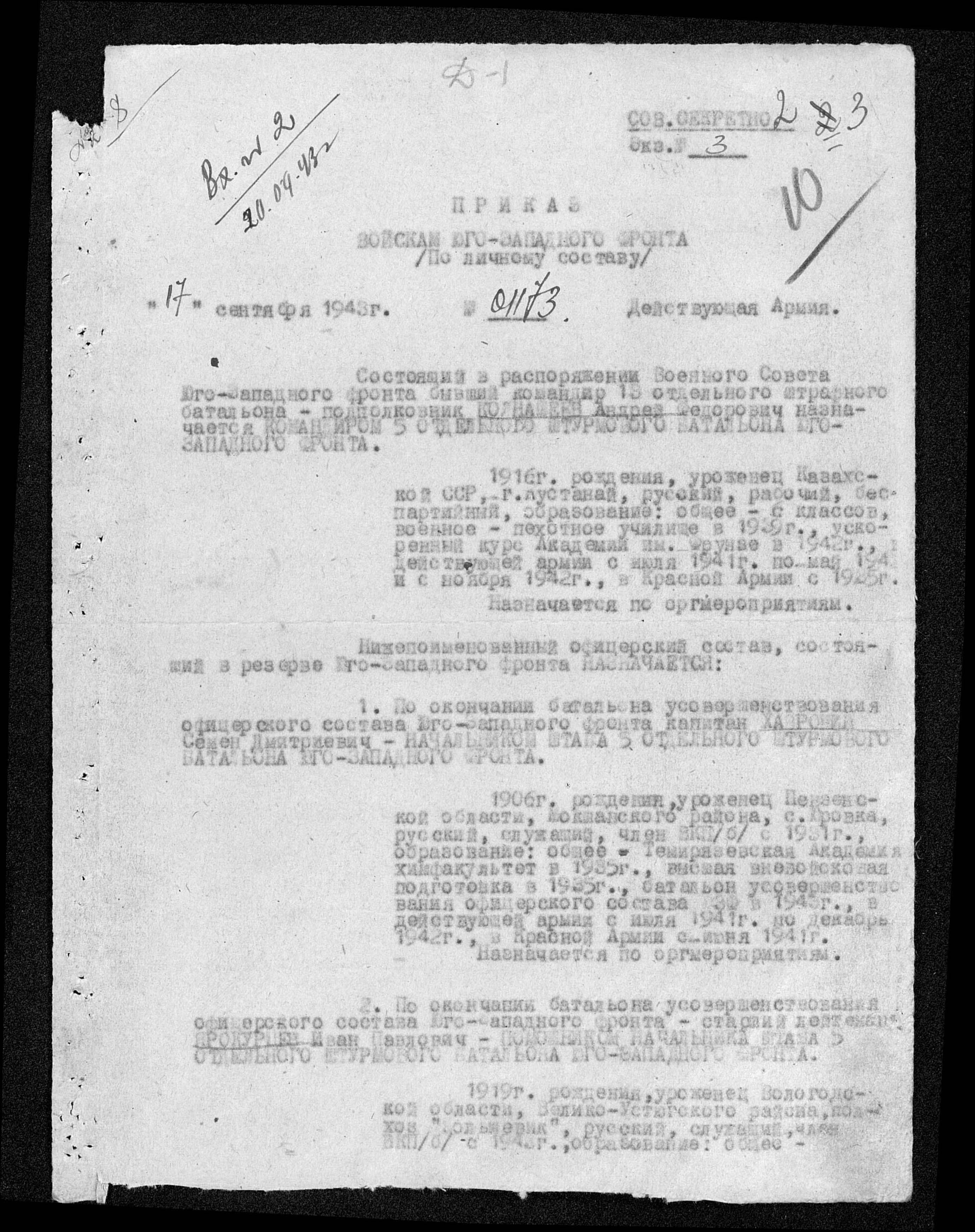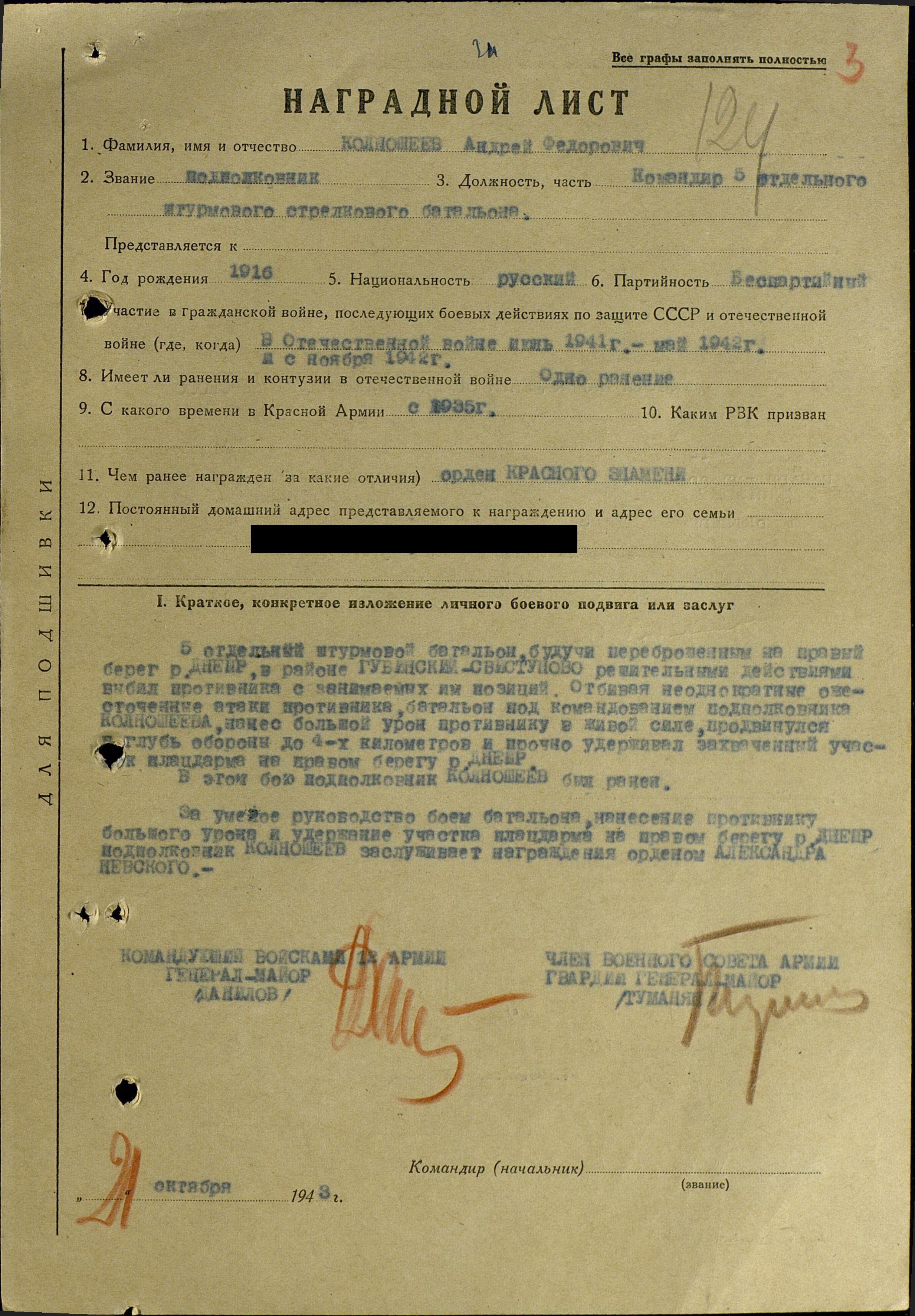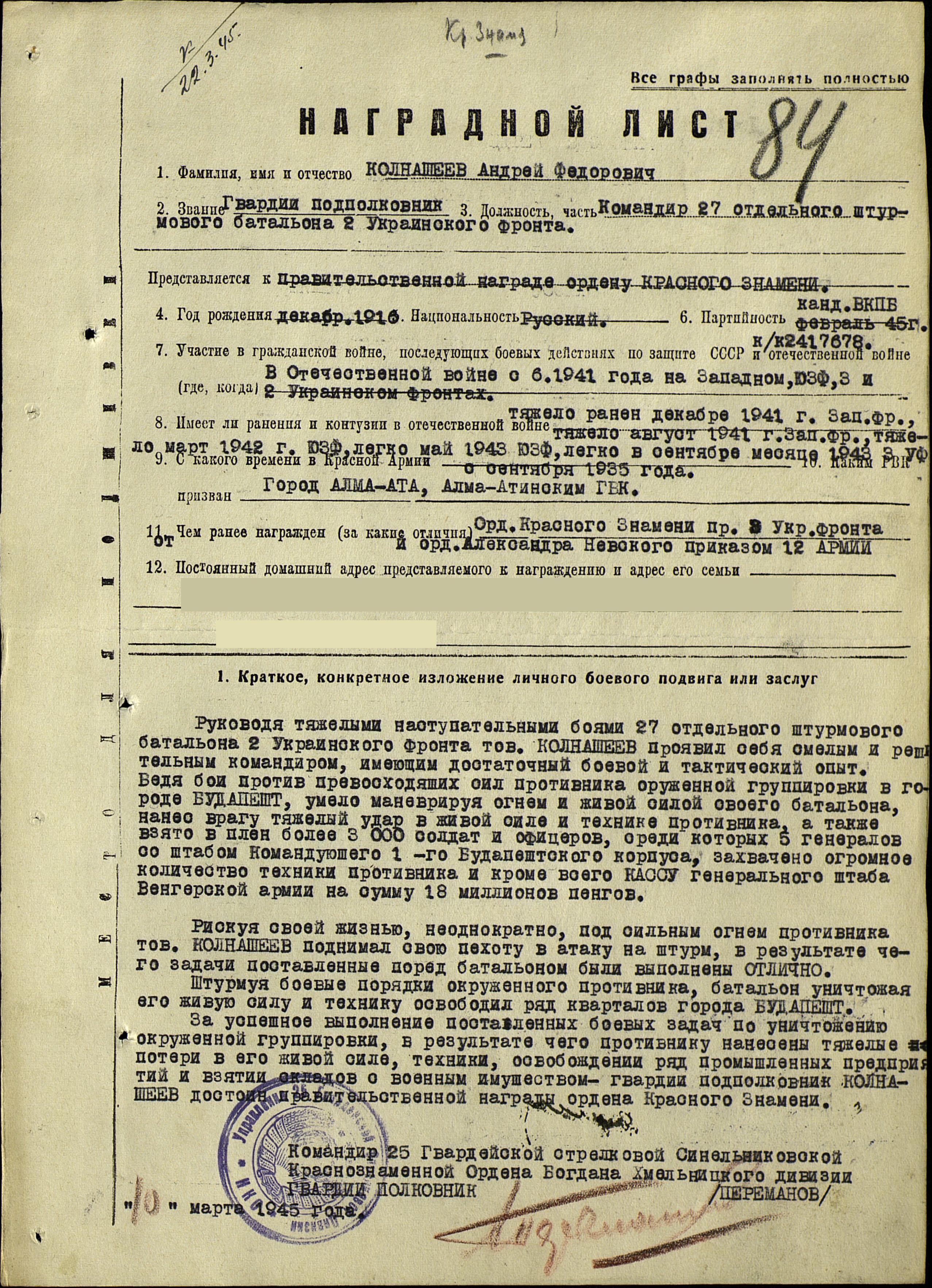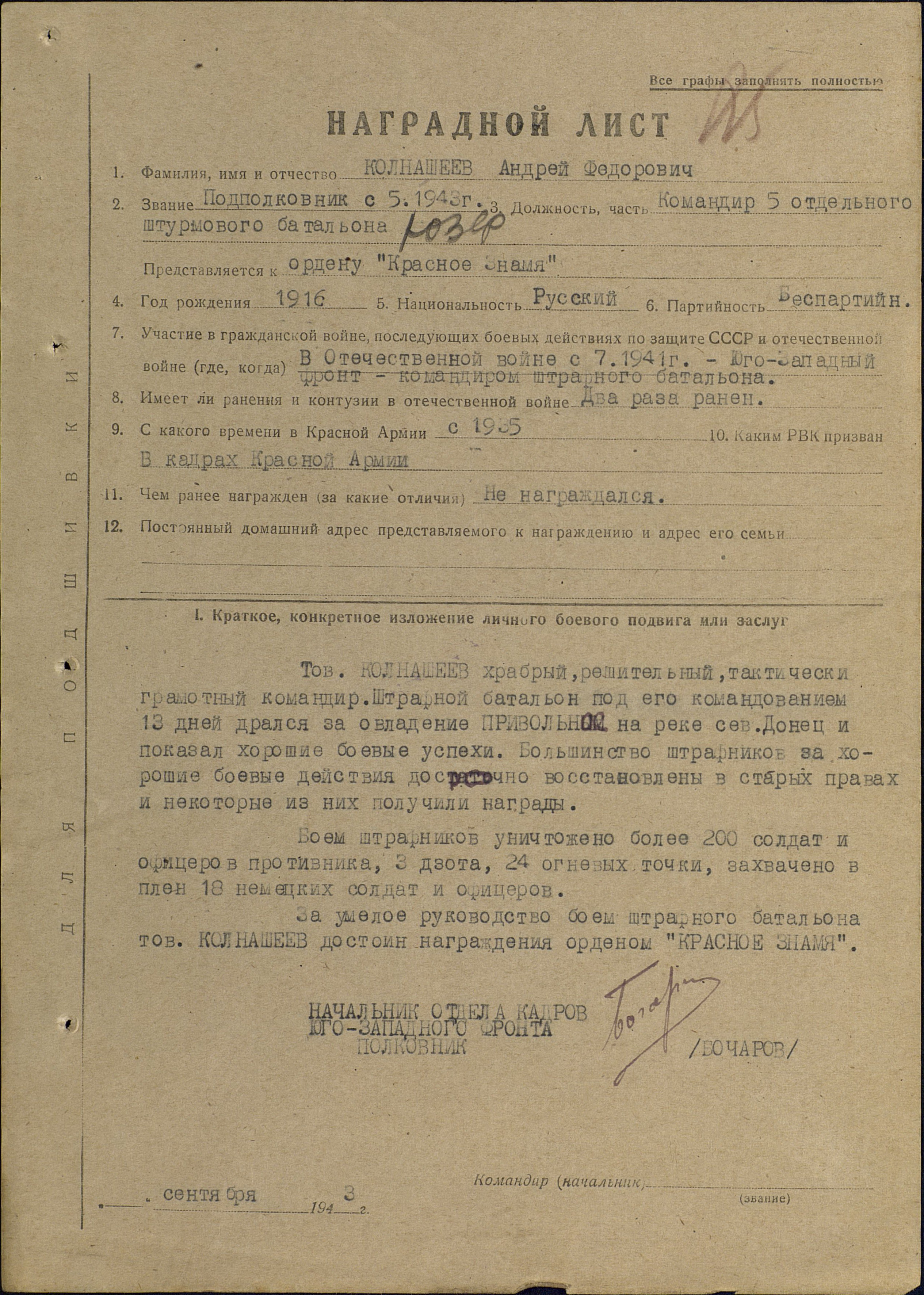 Колнашеев Андрей Федорович, гвардии полковник, декабрь 1916 г.р., уроженец Казахской ССР, г. Кустанай, русский, беспартийный (кандидат в члены ВКПБ в 1945 г), образование: общее 6 классов, военное -пехотное училище в 1939 году, ускоренный курс Академии им. Фрунзе в 1942 г.Кадровый офицер РККА с сентября 1935 года. Призван Алма-Атинским ГВК г. Алма-Ата 1935. В период Великой Отечественной Войны в действующей армии с июля 1941 года по май 1942 г и с ноября 1942 года по 1945 г.ПЕРВЫЙ КОМАНДИР 13 отдельного штрафного батальона Юго Западного Фронта. в период с ноября 1942 по август-сентябрь 1943 г.ПЕРВЫЙ КОМАНДИР 5 отдельного штурмового батальона Юго Западного Фронта / 3 Украинского форонта.Командир 27 отдельного штурмового батальона 2 и 3 Украинский Фронт.Награжден: Орденом Красного знамени 43 , Орденом Александра Невского 43, Орденом Красного знамени 45Прошел всю войну до 1945 года. Ранения: тяжело ранен -август 1941, тяжело ранен -декабрь 1941,Зап. Фронт, тяжело ранен- март 1942 го ЮЗФ, ранение май 1943 г ЮЗФ, ранение сентябрь 1943 г.В послевоенный период проживал в г Магнитогорск. до 1985 г. Сын и внук проживают в г. Магнитогорск.