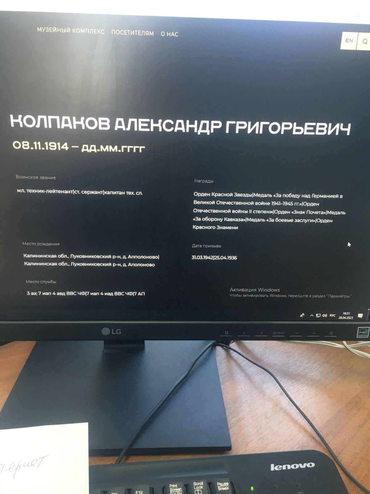 Работал механиком с-та показал себя одним из лучших авиационных специалистов полка. За период Отечественной войны лично обслужил 470 боевых самолетовылетов. Четыре раза получал денежное вознаграждение за безаварийные боевые вылеты. Участвуя в боевых действиях на ЧФ работал на передовых аэродромах Гостагаевская, Анапа и Лазаревская. В полевых условиях под воздействием самолетов противника с воздуха заменил 10 моторов, полностью восстановил 5 самолетов. Работу по восстановлению самолетов и моторов организовывал быстро и хорошо. Работая техником звена управления АП в дни освобождения Крыма и г. Севастополя не считаясь с отдыхом отдавал все свои силы и знания на отличную подготовку матчасти к боевым вылетам руководящего состава полка. Благодаря его отличным знаниям матчасти и умелому руководству техническим составом звена не было ни одного случая отказов и поломок материальной части самолетов, как в воздухе, так и на земле, по вине обслуживающего персонала.
