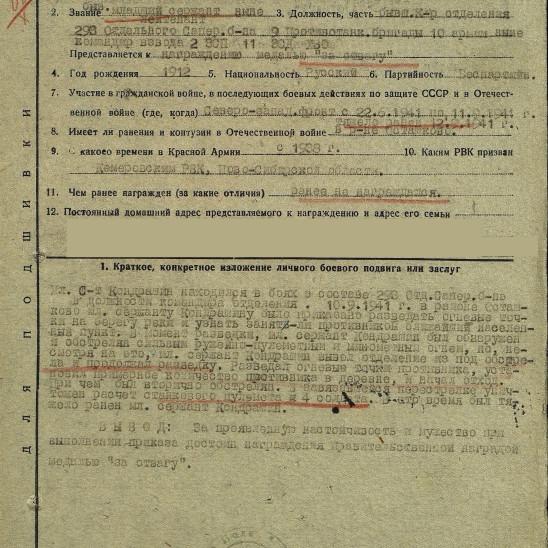 Кондрашин Фёдор Николаевич в 1938 году закончил лесной техникум и был призван в армию в декабре 1938 года в род войск - пехота в должности - стрелок. Воевал на Финской и в начале ВОВ. В районе села Осташково в звании мл. сержанта получил приказ разведать огневые точки противника. Задание группа под его руководством выполнила, хотя и была обнаружена и обстрелена минометным огнем. При возвращении группа была обстреляна повторно. В завязавшейся перестрелке был уничтожен расчет станкового пулемета. В это время Кондрашин Ф.Н. был тяжело ранен осколком мины. Задание было выполнено в связи с чем его предоставили к награде. Это видно из наградного листа. Ранение было тяжелое. Осколок попал в легкое, но врачи спасли жизнь, но осколок так и остался в легком, с ним и был похоронен. Четыре месяца был в эвакогоспитале, затем окончил Одесское пехотное училище курсантом и по его окончании был переведен по состоянию здоровья в запасной стрелковый полк в должности командира взвода и занимался подготовкой бойцов и отправкой их на фронт. Приказом Юж. УРВО № 360 от 18.07.1942 года присвоено звание - лейтенант. После войны женился и у него родились три дочери.
