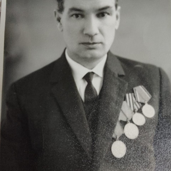Прадед родился 4/10 1920г в большой семье, у него было три брата и три сестры. Закончил 4 класса школы. Рано пошёл работать. С десяти лет работал учётчиком, а потом десятником в лесхозе. На войне был минометчиком, приходилось на себе носить ствол и станину миномёта. В 1944г в августе был тяжело ранен попал в госпиталь. Досталось и по рукам и по ногам, как он сам говорил. В последнем бою были ранения в ноги и руки и был контужен, не слышал на одно ухо. С госпиталя вышел с группой инвалидности. День Победы встретил в госпитале. Вышел из госпиталя в августе 1945г с осколком в оболочке сердца. Врачи побоялись оперировать. Был награждён медалью за отвагу и за победу под Сталинградом. Но вскоре её сняли. Служил в армии после войны старшиной, воинская часть находилась под Свободным, потом её перевели в Белогорск, но он отказался, в семье у него было уже четверо детей. Работал кладовщиком базы Дорурса, а потом завскладом базы Рособувьторга до пенсии. На пенсию ушёл раньше, по состоянию здоровья. Сказались ранения. Умер 2 июня 1999 г. За последний бой был награждён орденом Красной звезды, но при жизни он её не получил. Награда попала к родственникам после его смерти.