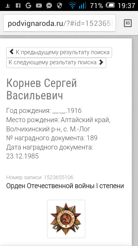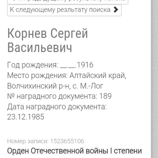 Очень редко рассказывал о войне, всегда плакал. Помню как говорил, что они пришли в одну деревню,а там все убитые и девушка молоденькая,очень красивая с длинными волосами, возле колодца лежит с открытыми глазами.Рассказывал и плакал в захлеп.Знаю что в начале войны был связистом, был ранен 2 раза. Лежал в Новосибирском госпитале.К сожалению очень мало знаю.