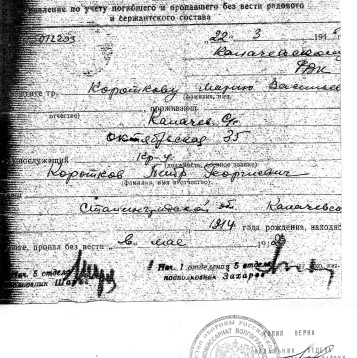призыва в Сталинградской области, Калач на Дону, ул. Октябрьская, д. 35, работал плотником, его жена- Короткова Мария Васильевна (1915