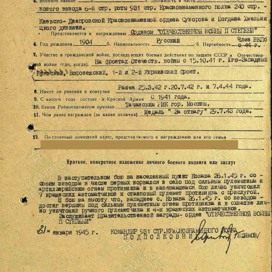 Коряков Тимофей Васильевич,участник Финской войны 1939 г.По окончании военных действий был демобилизован,работал на 1-Шарикоподшипниковском заводе-штамповщик. Член партии ВКПБ.Ушел добровольцем на фронт в октябре 1941 из Москвы,Таганский военкомат. г.Боевой путь с 1941 г по февраль 1945 г,в составе 1 и 2 Украинского фронта,род войск- Пехота-931 стрелковый полк 240 стрелковой дивизии ,161 гвардейский стрелковый полк 53 гвардейской стрелковой дивизии .Несколько раз был ранен в 1942,1944,1945 г.Тяжелое ранение в боях за освобождение Чехословакии- село Кокава,в феврале 1945 г,после чего отправлен в госпитале до ноября 1945. После излечения вернулся на 1-Шарикоподшипниковский завод ,работал в парткоме завода ,до сентября 1957 г.Имеет награды -"Медаль за Отвагу" и "Орден Отечественной войны 2 степени".
