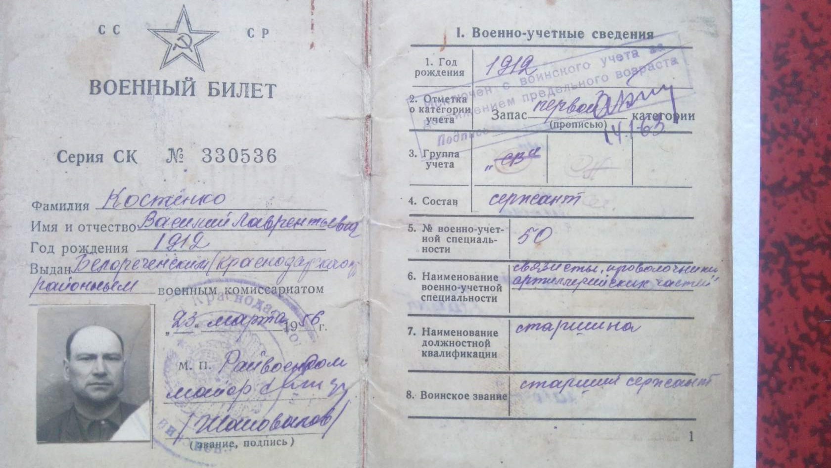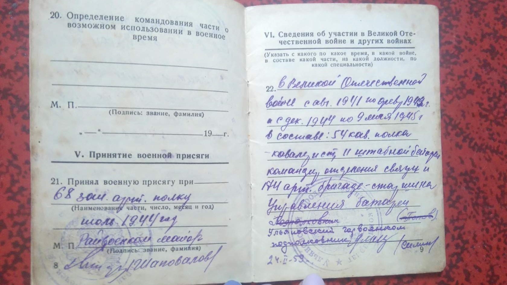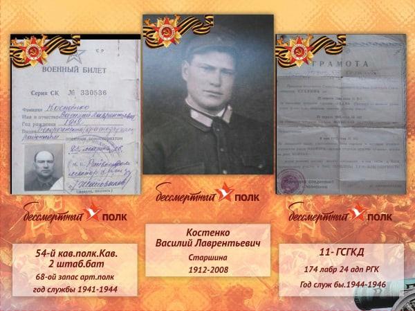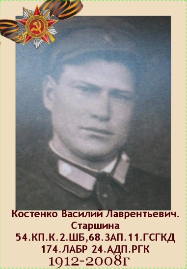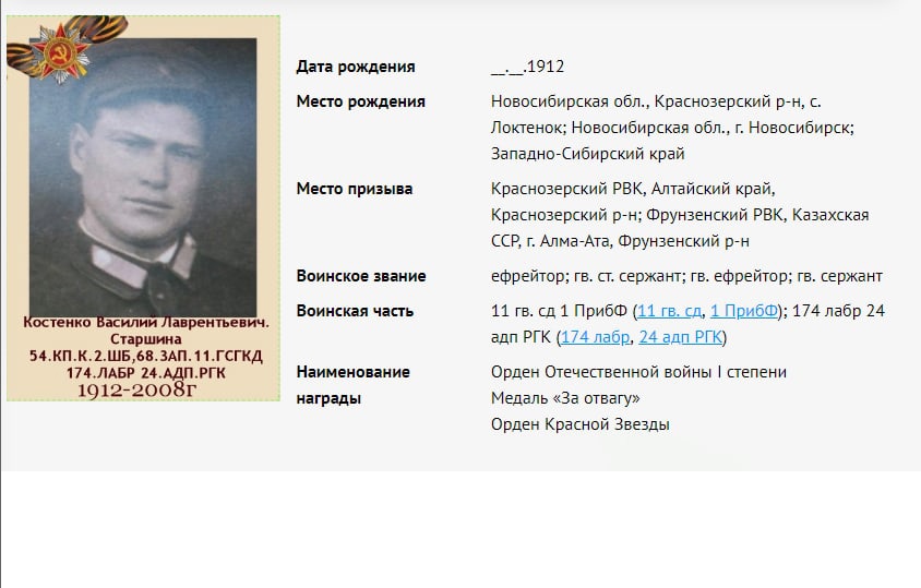 Костенко В.Л 1912 г/р . Его служба началась в Августе 1941 года. Битву за Москву, был в 54 Кав.полк кав.2-й штабной Батареи, 44 кав.Див. 44 кд была вся разбита полностью, выжили немного, Костенко сильно ранен был отправлен в Госпиталь в г Алмату и долго восстанавливался. Вот что пишут Предположительно с северо-восточной стороны деревни Мусино. Происходило 16-17 ноября 1941 года в ходе продолжения контр-наступления совместно с 58 танковой дивизией. В дивизии к 20 ноября из 198 танков осталось 15, идущие с ними 44-ю и 17-ю кавалерийские дивизии немцы расстреливали из орудий и пулеметов. Об этом стало известно из документов 4-й немецкой полевой армии. По советским источникам дивизия упоминается как "прибывшая неподкованной" и "доставившая много хлопот", об участии в боевых действиях не сообщается. Очевидец расстрела 44-й дивизии в Мусино говорит, что за шесть минут было убито 2000 всадников. Бои на Ярополецком направлении играли важную роль в обороне Москвы, особенно для прикрытия 316 дивизии Панфилова в районе севернее Волоколамска. А вот и Немецкий Источник Вот что пишут Пауль Карель «Восточный фронт», т.1 (по журналу боевых действий 4-й танковой группы под Москвой): 16 ноября 5-й пехотный корпус Гёпнера начал атаку на город Клин, расположенный на северо-западе от Москвы на дороге к Калинину. Слева, в соответствии с планом, предстояло наступать 56-му танковому корпусу 3-й танковой армии. Около Мусина, что к юго-западу от Клина, забрезжил рассвет – рассвет 17 ноября, серый и туманный. Ближе к 09.00 сквозь утреннюю дымку показался большой красный диск солнца. Наблюдательный пункт батареи тяжелых орудий располагался на холме. Километрах в трех дальше виднелся лес. Поля покрывало тонкое снежное одеяло. Было холодно. Все ждали приказа атаковать. 10.00. Командиры приникли к биноклям. На опушке леса появилась кавалерия. Идя на галопе, она скрылась за холмом. - Русские танки! – раздался возглас. По замерзшей земле катились три Т-34. С окраины села открыли огонь противотанковые пушки. Казалось странным, что танки и дут одни, без поддержки пехоты. Что бы это могло значить? Пока артиллерийские наблюдатели пытались разгадать загадку, раздался другой возглас: - Внимание! Справа от леса кавалерия. Так и было. Конники – передовой разъезд из сорока или пятидесяти человек – приближались на рыси. Вот численность отряда выросла до сотни или двух, а мгновением позже они вылетели из леса широким фронтом. Эскадрон за эскадроном они развернулись в гигантскую линию. Моя статья https://dzen.ru/a/XzA9UDcpAjkIf_r8