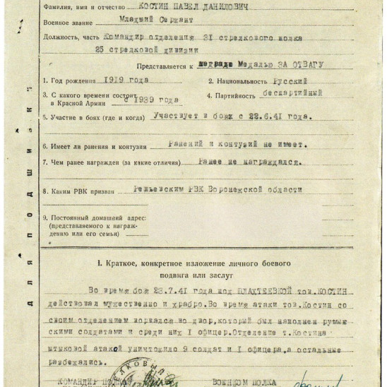 За этот подвиг он был представлен к награде Медалью "За отвагу" Указом Президиума Верховного Совета СССР от 10.02.1942.