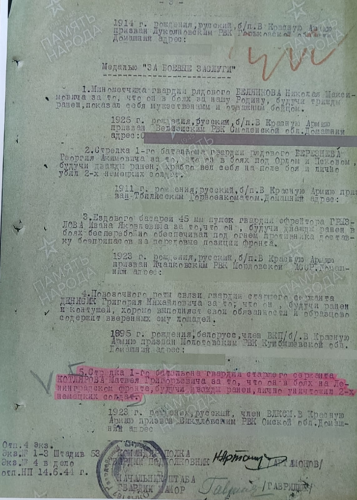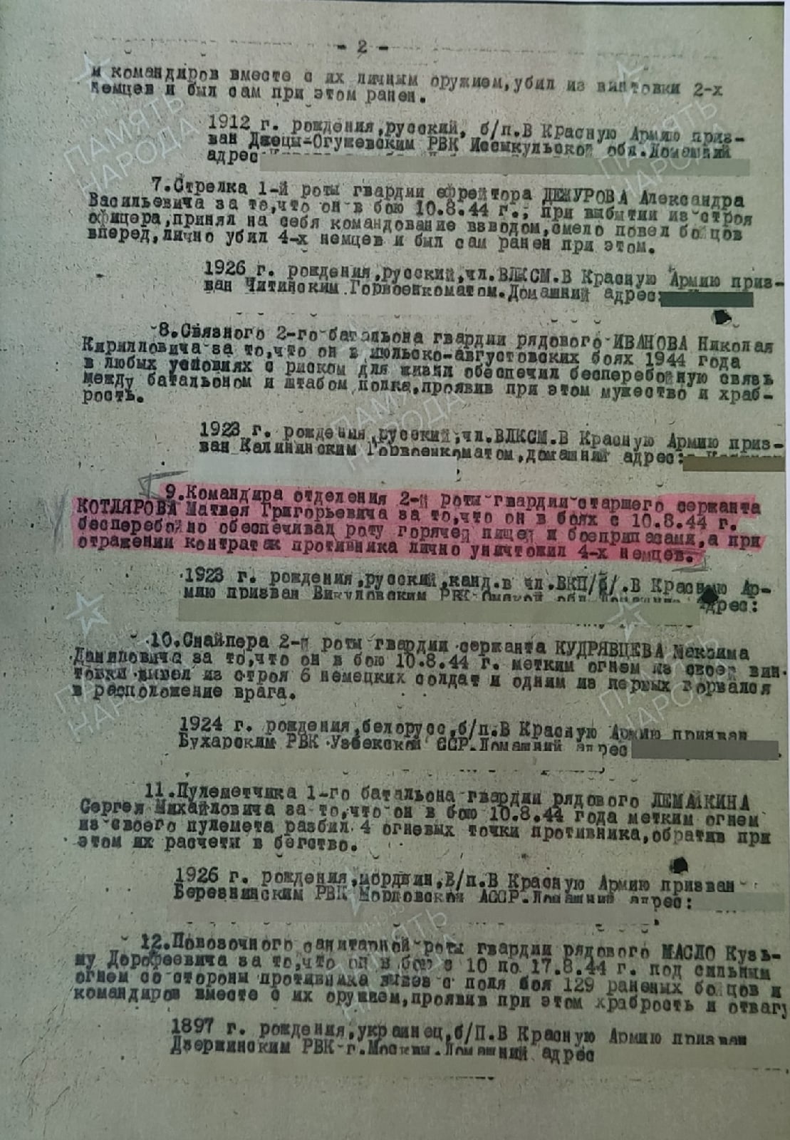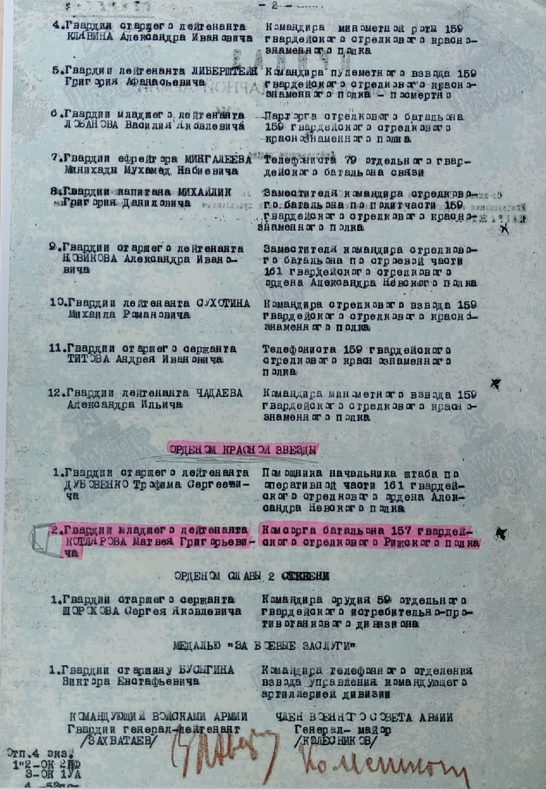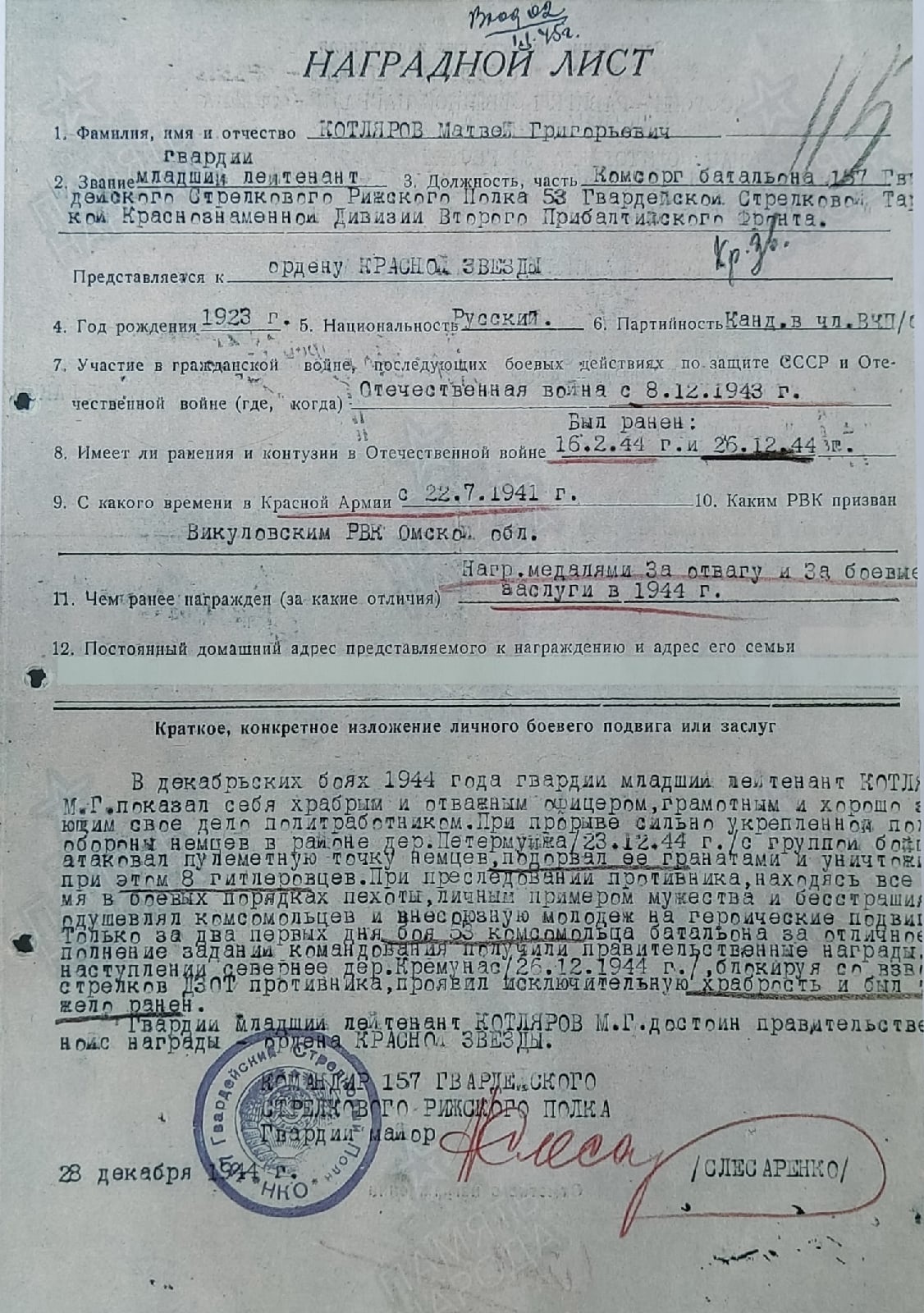 Комсорг батальона 157 гвардейского стрелкового Рижского полка Котляров Матвей Григорьевич 12.01.1945 года был награжден Орденом «Красная звезда».