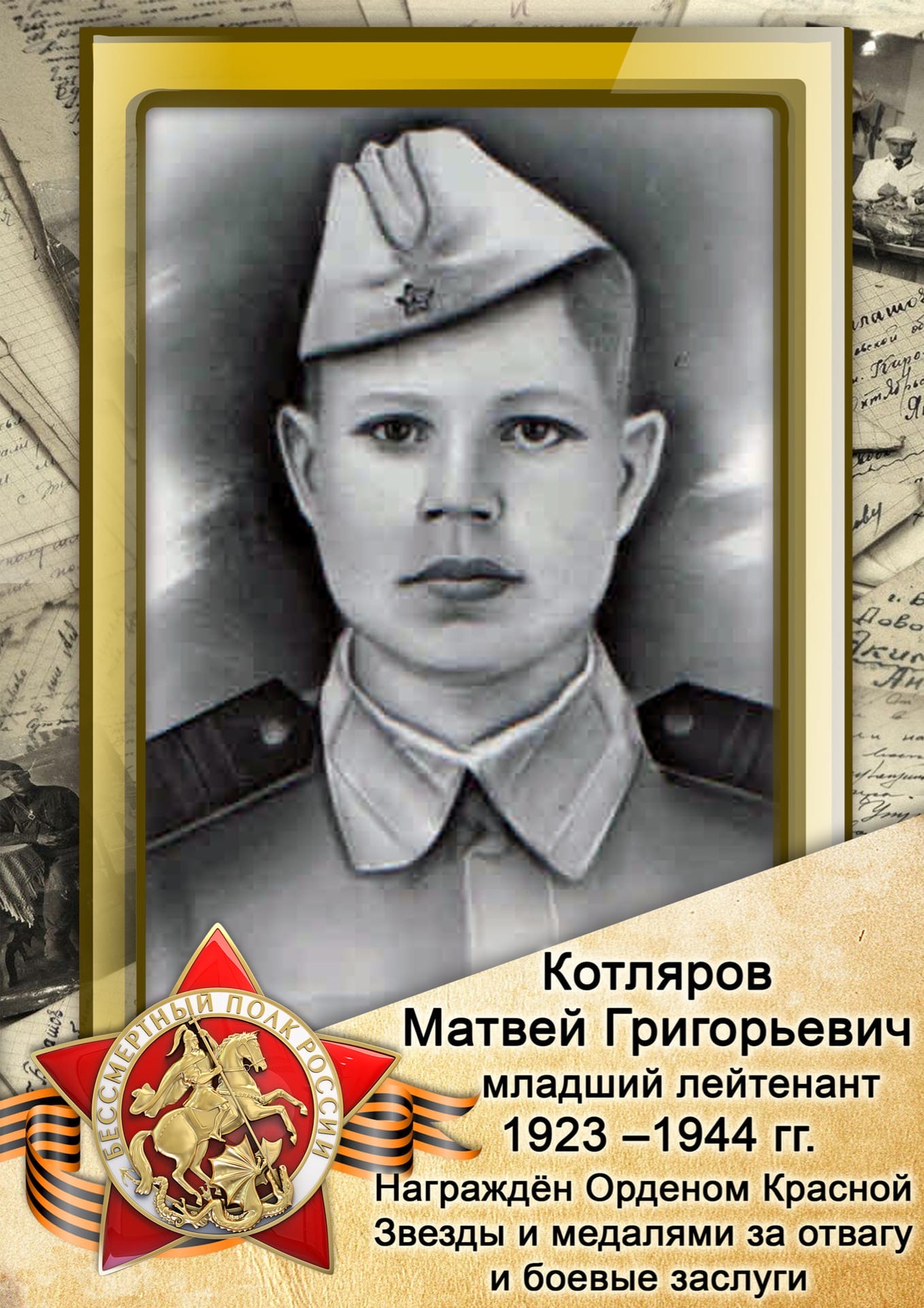 Матвей Григорьевич - младший лейтенант, Комсорг батальона 53 Гвардейской Стрелковой Краснознаменной Дивизии. Служил в Красной Армии с 22.07.1941 года. Участвовал в Отечественной войне с 08.12.1943 года. Был ранен – 16.02.1944 года и 26.12.1944 года.