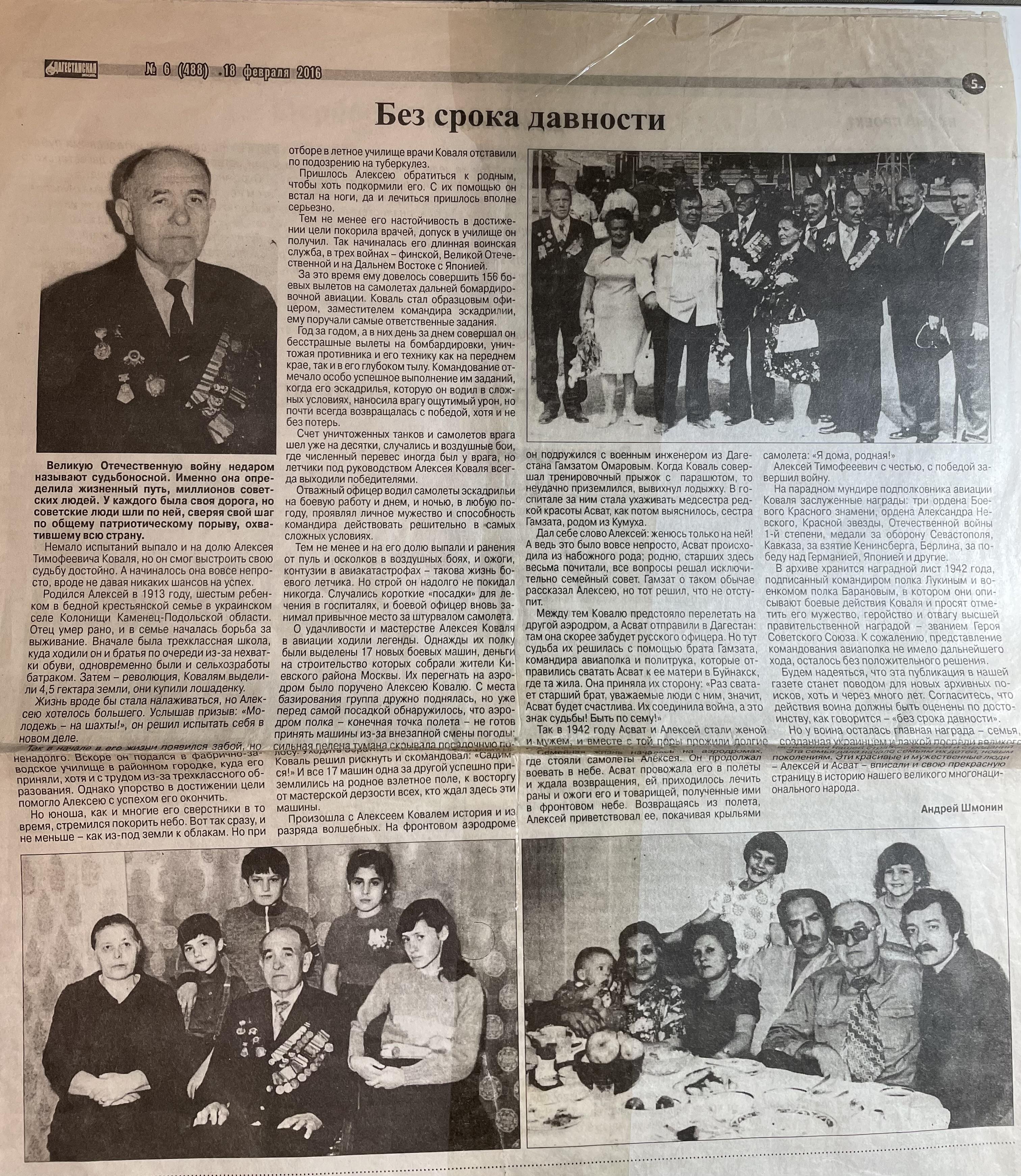 Великую Отечественную войну недаром называют судьбоносной. Именно она определила жизненный путь, миллионов советских людей. У каждого была своя дорога, но советские люди шли по ней, сверяя свой шаг по общему патриотическому порыву, охватившему всю страну. Немало испытаний выпало и на долю Алексея Тимофеевича Коваля, но он смог выстроить свою судьбу достойно. А начиналось она вовсе непросто, вроде не давая никаких шансов на успех. Родился Алексей в 1913 году, шестым ребенком в бедной крестьянской семье в украинском селе Колонищи Каменец-Подольской области. Отец умер рано, и в семье началась борьба за выживание. Вначале была трехклассная школа, куда ходили он и братья по очереди из-за нехватки обуви, одновременно были и сельхозработы батраком. Затем - революция, Ковалям выделили 4,5 гектара земли, они купили лошаденку. Жизнь вроде бы стала налаживаться, но Алексею хотелось большего. Услышав призыв: «Молодежь - на шахты!», он решил испытать себя в новом деле. Так в начале в его жизни появился забой, но ненадолго. Вскоре он подался в фабрично-заводское училище в районном городке, куда его приняли, хотя и с трудом из-за трехклассного образования. Однако упорство в достижении цели помогло Алексею с успехом его окончить. Но юноша, как и многие его сверстники в то время, стремился покорить небо. Вот так сразу, и не меньше - как из-под земли к облакам. Но при отборе в летное училище врачи Коваля отставили по подозрению на туберкулез. Пришлось Алексею обратиться к родным, чтобы хоть подкормили его. С их помощью он встал на ноги, да и лечиться пришлось вполне серьезно. Тем не менее его настойчивость в достижении цели покорила врачей, допуск в училище он получил. Так начиналась его длинная воинская служба, в трех войнах - финской, Великой Отечественной и на Дальнем Востоке с Японией. За это время ему довелось совершить 156 боевых вылетов на самолетах дальней бомардировочной авиации. Коваль стал образцовым офицером, заместителем командира эскадрилии, ему поручали самые ответственные задания. Год за годом, а в них день за днем совершал он бесстрашные вылеты на бомбардировки, уничтожая противника и его технику как на переднем крае, так и в его глубоком тылу. Командование отмечало особо успешное выполнение им заданий, когда его эскадрилья, которую он водил в сложных условиях, наносила врагу ощутимый урон, но почти всегда возвращалась с победой, хотя и не без потерь. Счет уничтоженных танков и самолетов врага шел уже на десятки, случались и воздушные бои, где численный перевес иногда был у врага, но летчики под руководством Алексея Коваля всегда выходили победителями. Отважный офицер водил самолеты эскадрильи на боевую работу и днем, и ночью, в любую погоду, проявлял личное мужество и способность командира действовать решительно в самых сложных условиях. Тем не менее и на его долю выпали и ранения от пуль и осколков в воздушных боях, и ожоги, контузии в авиакатастрофах - такова жизнь боевого летчика. Но строй он надолго не покидал никогда. Случались короткие «посадки» для лечения в госпиталях, и боевой офицер вновь занимал привычное место за штурвалом самолета. О удачливости и мастерстве Алексея Коваля в авиации ходили легенды. Однажды их полку были выделены 17 новых боевых машин, деньги на строительство которых собрали жители Киевского района Москвы. Их пе