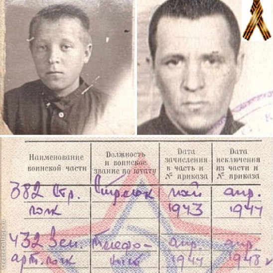 Его старший брат, когда началась война ушел на фронт, мой дед остался один. Родители у него рано умерли, старшие сестры разъехались, а они вдвоем с братом жили в отцовском доме. В 1941 году он поступил учится в ФЗО в г. Тотьма (Вологодская обл.). Закончил это училище и его направили работать в г. Курган на военный завод. Как он попал на фронт - он никогда не рассказывал, справка, которую запрашивала моя бабушка, говорит о том, что он оставил производство самовольно. Это было в 1943 году. Тогда убегали на фронт многие, видимо и он сбежал на фронт, прибавив себе возраст. Служил в танковом полку, которым командовал генерал Лелющенко, это был Белорусский фронт, был связистом.