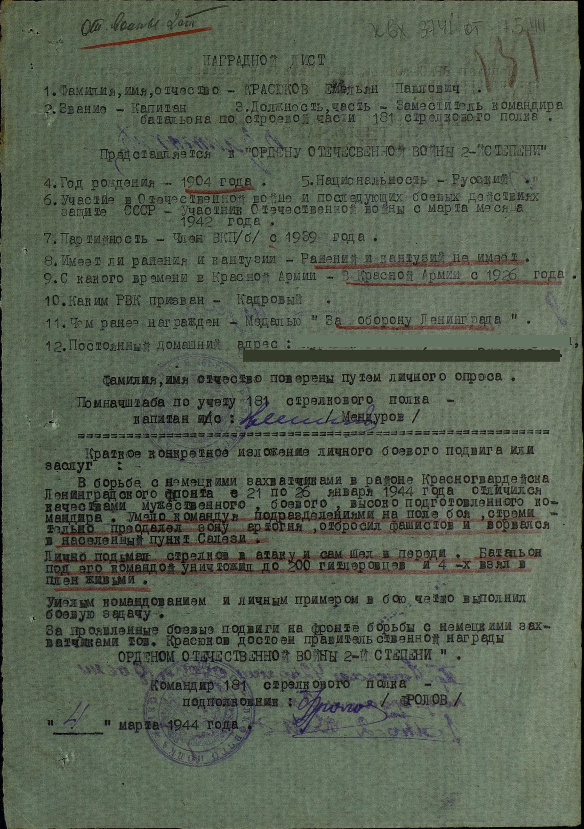 звание капитана. С 21 декабря 1941 по 17 марта 1943г в составе 181 стрелкового