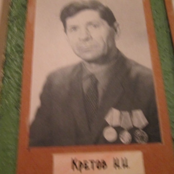 Наш прадедушка Кретов Николай Иванович родился 27 октября 1915 года. В 1939 году был призван в армию и был отправлен на Финскую войну 1939-1940год. После армии работал на заводе в городе Николаеве, Украина. В 1941 году началась ВОВ, наш прадедушка вернулся домой в село Гофицкое и был призван на фронт. Попал под Смоленск. В нашей семье сохранились письма прадедушки, которые он писал своим родителям и сестрам. Зимой, в конце 1944 года был ранен и находился в госпитале до мая 1945года. День победы он встретил в госпитале. Наш прадедушка имел две медали: первая медаль за Отвагу;вторая медаль за Победу в ВОВ. После госпиталя вернулся в село Гофицкое. Окончил курсы агронома, и стал работать в колхозе. В колхоз приехала Пушкарская Евдокия Ильинична и стала работать агрономом. Они познакомились. Создали семью. В семье родилось трое детей. Прадедушка построил большой дом. Работал в колхозе до пенсии. Умер 13 марта 1984 году. Прабабушка Кретова Евдокия Ильинична сдала медали в музей села Гофицкого. Сейчас в музее на стенде Они воевали висит фотография нашего прадедушки Кретова Николая Ивановича. Мы очень гордимся, что у нас был такой Прадедушка!