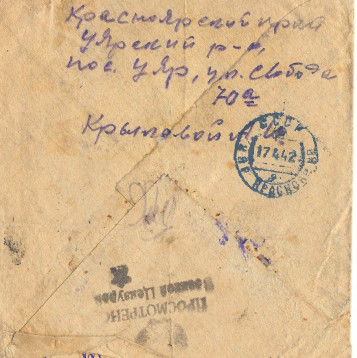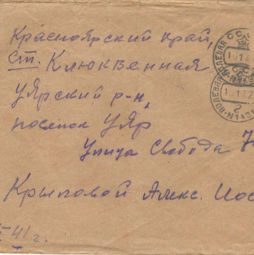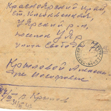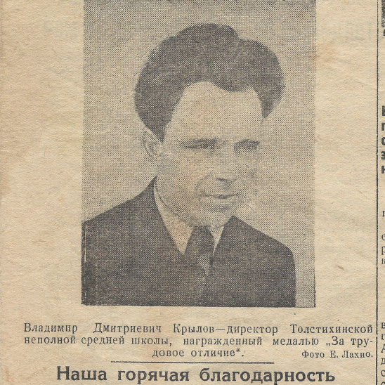 Мой дедушка, Крылов Владимир Дмитриевич, в июне 1939 награждался в Москве медалью "За Трудовое Отличие" среди учителей сельских школ. Работал директором Уярской школы №2 и осенью 41года был призван армию. Формирование проходил в г. Канск, Красноярского края, был назначен политруком роты минометного батальона 1244 стрелкового полка, 374 стрелковой девизии. Боевые действия дивизия начала в первых числах 1942 года. Выбыл по ранению в марте 1942 года под Спасскую Полесть, из письма домой сообщил, что ранение руки произошло от осколка мины. В апреле был выписан из полевого госпиталя и Приказом Волховского фронта №0210 от 24.04.1942г. ему присвоено очередное воинское звание "Старший политрук". Из донесения командира 1244 сп. капитана Савостина: В боях с немецкими оккупантами в районе д. Новая Кересть Чудовского р-на Ленинградской области с поля боя не возвратился и труп его обнаружен не был, и поэтому считаем пропавшим безвести 25.06.1942 года. Из другого донесения помошника нач. штаба капитана Розенкова, в списке безвозвратных потерь за период с 26.05. - 26.06.42г. по 1244 с.п. На последней странице рапорта добавлено, что всего погибло и пропало безвести среднего и командирского состава 90 человек, похоронен в братской могиле у с. Новая Кересть у стены по к.№1100.