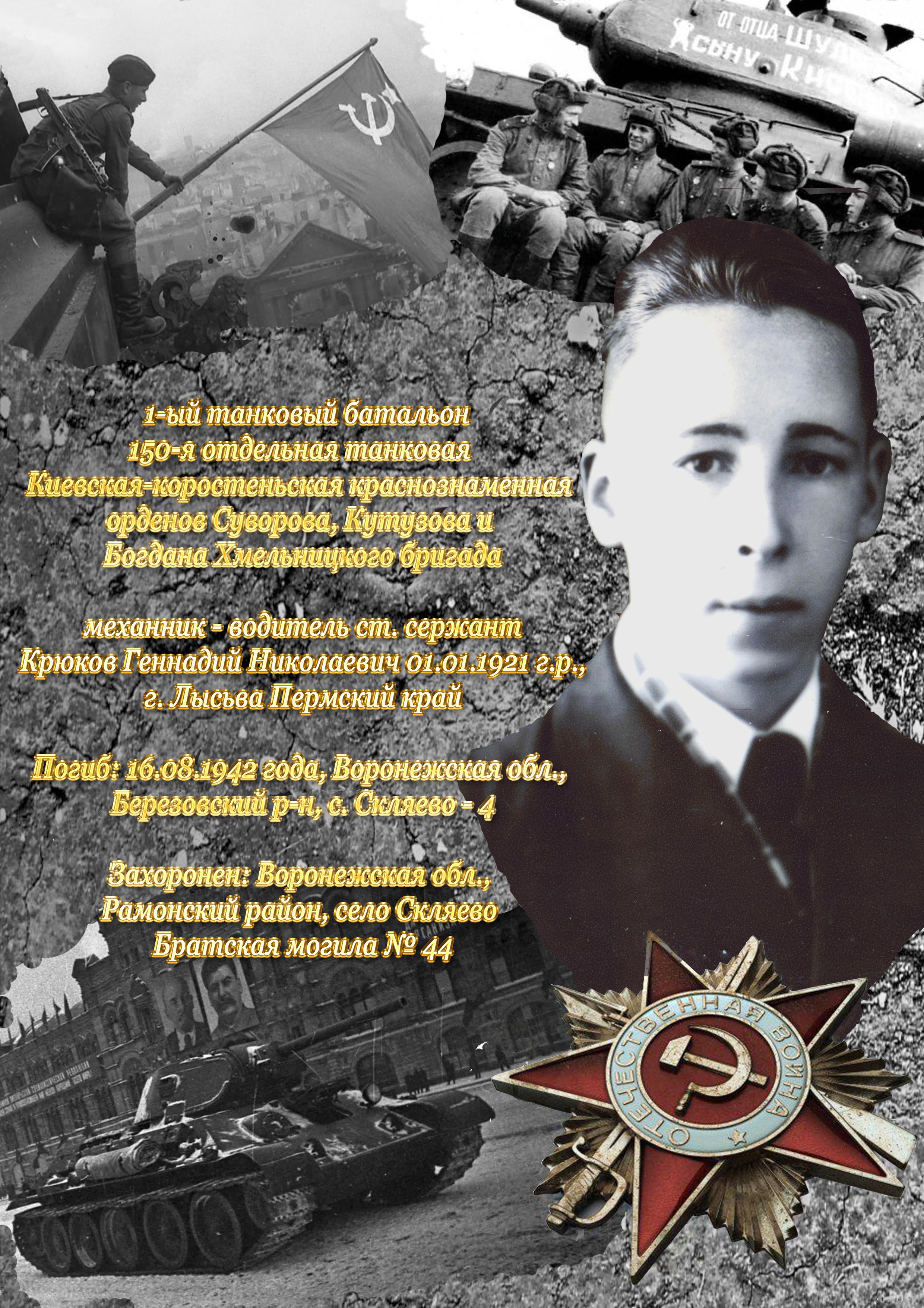 мой родной дед Крюков Геннадий Николаевич механик-водитель 150 отбр (танковая бригада) непосредственно принимал участия в боя за город Москву октября-ноябре 1941 года , 150 отбр, командир бригады полковник танковых войск Бахаров Борис Сергеевич, ввела бои с противником (с войсками Вермахта) город Ефремов , Тульская область. 6 декабря 1941 года 150 отбр совместно со стрелковой дивизии освободили город Елец, Липецкой области. В 2005 году жители города Ельца в знак благодарности поставили памятник танкистам 150 отбр. 16 августа 1942 года село Склево-4 Березовский район, Воронежская область мой дед Крюков Г.Н. и его экипаж танка-т-34-76 погиб. Захоронены братская могила №44 село Скляево, Рамонский район. Воронежская область.
