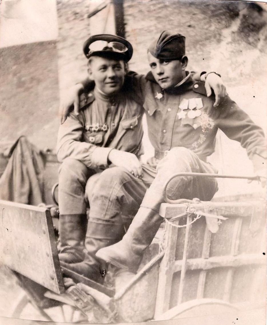 Разведчик батареи управления 11 артд РГК: Куркин Виктор Николаевич родился в Брянске, призывался из Челябинской обл. Участник Сталинградской битвы. Награды Медаль «За оборону Сталинграда» Медаль «За отвагу» №: 17/н от: 05.11.1943 Издан: 11 артд РГК 7 гв. А 2 УкрФ. За личный захват «языка», был награжден Орденом Славы III степени Приказ № 2/н от: 24.01.1945 Издан: 11 артд РГК 2 УкрФ. В 1944 за захват унтер-офицера и солдата его представляли к Ордену Славы III степени, наградили Орденом Красной Звезды №: 32/н от: 08.09.1944 Издан: 11 артд РГК. На фотографии он с командиром взвода разведки ст. лейтенантом - Кузьминым Петром Яковлевичем (17.10.1921- 28.02.1983 г. Губкин). Период создания фотографии: апрель 1945 г. Место создания: Австрия, г. Густопече. Местонахождение Госкатолог - Губкинский краеведческий музей