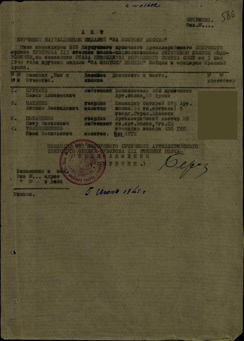 Родился в Кузбассе, в селе Калачёво Прокопьевского района. В 1937 г. окончил педагогический техникум и работал заведующим начальной сельской школы. В 1939 г. призван на действительную военную службу. Когда началась война, был отправлен на Западный фронт наводчиком орудия 486-го артиллерийского полка. Первую боевую медаль получил за то, что прямой наводкой уничтожил немецкий дзот. В 1944 г. откомандирован на учёбу в Томское артиллерийское училище. Через полгода направлен в 33-й артиллерийский полк в чине младшего лейтенанта командира взвода на Карельский фронт. Освобождал Советское Заполярье, в боях проявлял отвагу, смелость и хладнокровность, уничтожая огневые точки противника. В Заполярье встретил День Победы, но на военной службе остался до 1947 г. Потом учился в высшей артиллерийской школе в Ленинграде, служил в Западно-Сибирском и Дальневосточном военном округах до 1955 г. Награждён двумя орденами Красной Звезды. После демобилизации вернулся в Новокузнецк к любимой мирной профессии. Работал в школе № 25 учителем трудового воспитания и военного дела, был директором Станции юных техников. За учительский труд удостоен почётного звания «Отличник просвещения». После выхода на пенсию участвовал в военно-патриотическом воспитании молодёжи. Принимал участие Битва защиты города Москва, Битва за Заполярье— боевые действия войск Северного и Карельского фронтов Медаль «За оборону Москвы» Наградной документ Дата рождения: 10.04.1918 Воинское звание: капитан Кто наградил: Президиум ВС СССР Наименование награды: Медаль «За оборону Москвы» Дата документа: 01.05.1944