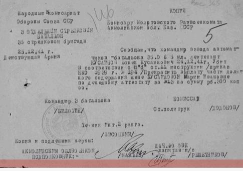 Призывался Акмолинским областным комиссариатом, Молотовский райвоенкомат , сформированы были в Алма Ате и в составе 35 бригады , 3 стрелкового батальона участвовал в боях за Москву. Погиб в 24 декабря 1941 года , в д.Пагубно, Волоколамского района в звании мл. лейтенант ,командир взвода автоматчиков, похоронен там же в братской могиле . Правда изначально на обелиске Братской могилы имя деда было выбито с ошибкой ,из за чего было затруднительно сразу найти эту конкретную Братскую могилу. Ведь их там несколько в непосредственной близости. Но в последствии фамилия была добавлена в правильном написании. Получается так что дед увековечен дважды. Сам дед был из многодетной семьи ,но все выросли детском доме. Мама помнит фотографию где запечатлены все братья и сестра ,совершеннолетние, вместе. Но фотография утеряна и вместе с этим утеряна возможность поиска его родных. Пытаемся искать до сих пор, посылаем запросы и социальные казахские социальные сети , но без результатно.